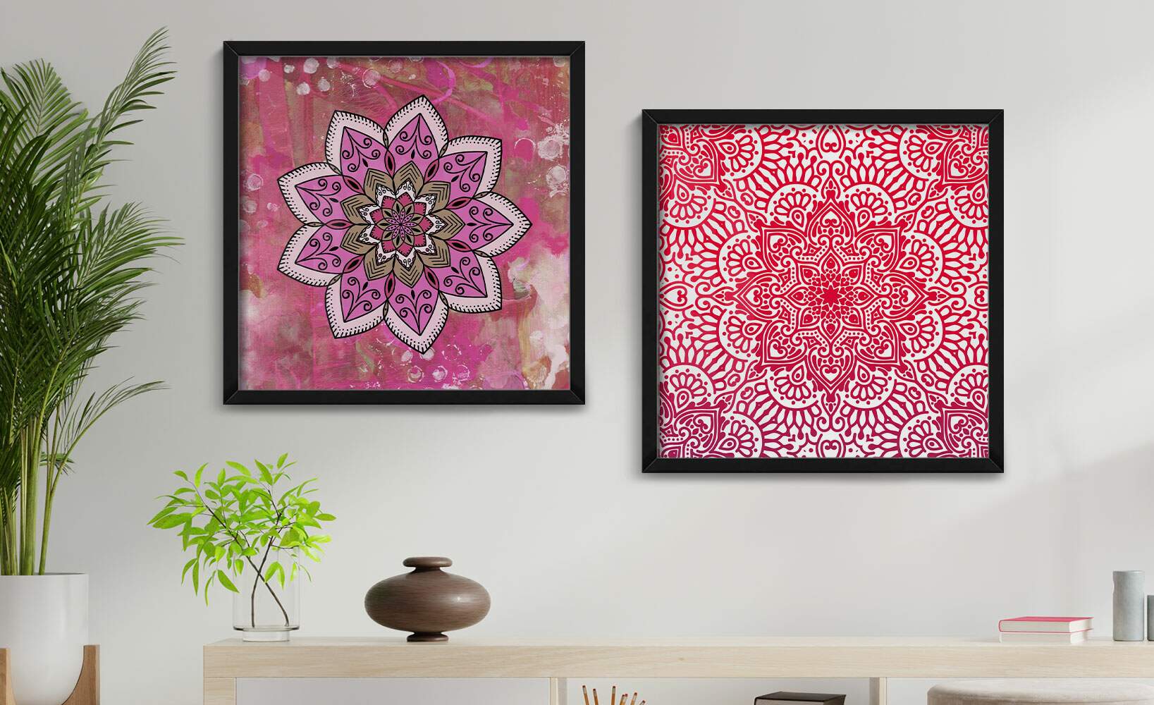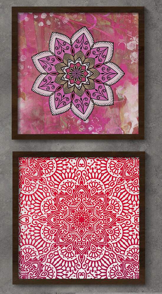 2 Quadros Decorativo Quadrado Mandala Rosa