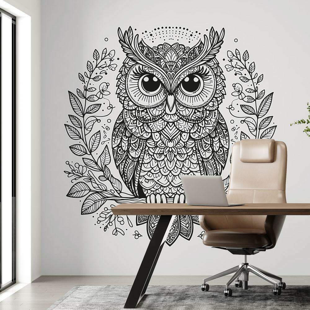 Adesivo de Parede Coruja Mandala Detalhada em Preto e Branco