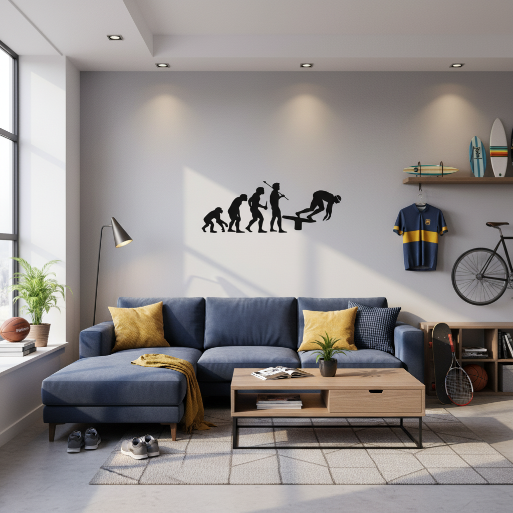 A coleção de Adesivos de Parede Evolução da Natação é perfeita para os amantes da natação e da evolução humana. A imagem retrata a jornada desde nossos ancestrais primatas até o homem moderno, destacando marcos importantes como o uso de ferramentas e a postura ereta. O nadador final simboliza o desenvolvimento e adaptação contínua do ser humano ao longo do tempo. Transforme sua parede em uma verdadeira obra de arte que representa a superação e evolução constante. Adquira já o seu adesivo e mergulhe nessa história visualmente incrível!