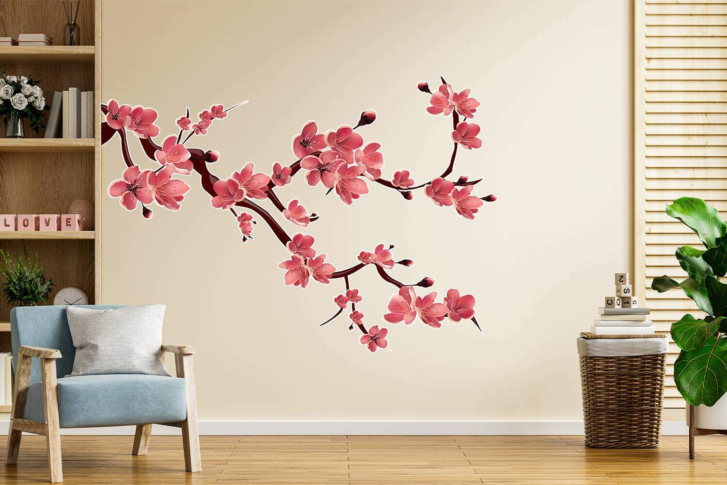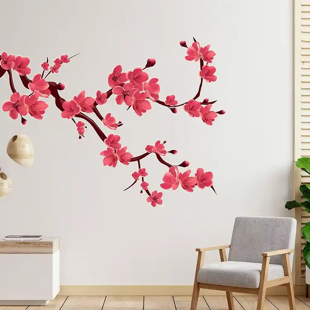 Adesivo de Parede Floral Sakura em Galhos Repleto de Flores Vermelhas