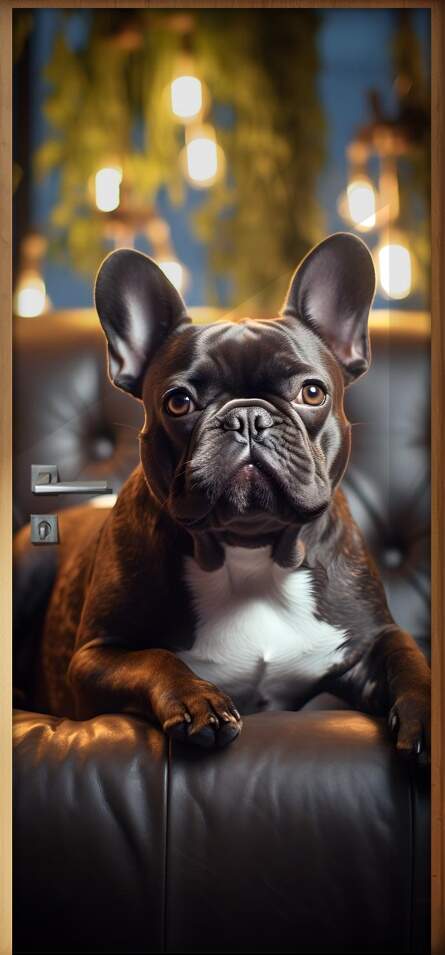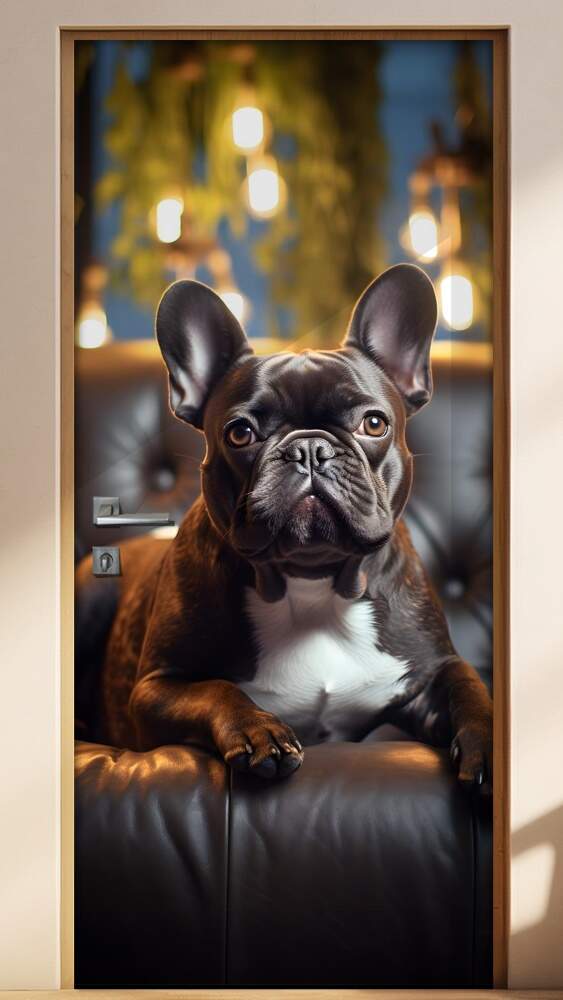Este adesivo de porta apresenta um charmoso Cachorro Bulldog Francês relaxando em um sofá luxuoso. Com suas orelhas grandes e expressão adorável, o bulldog transmite uma sensação de companheirismo e elegância. Ideal para quem busca uma decoração que una sofisticação e a fofura canina, este adesivo é perfeito para dar um toque especial ao ambiente. Garanta o seu e transforme sua porta em um elemento de destaque cheio de personalidade!