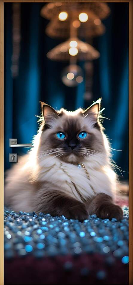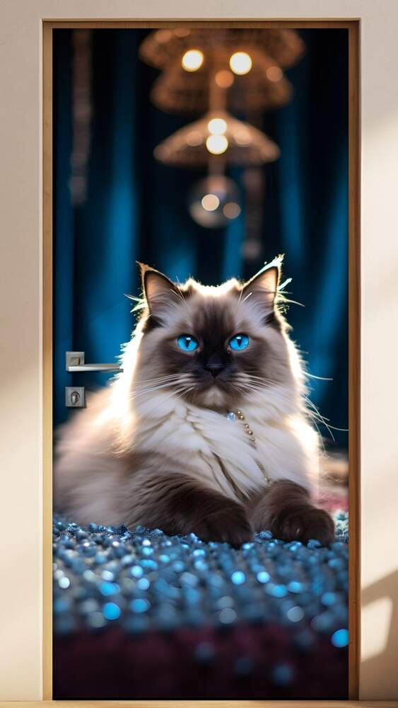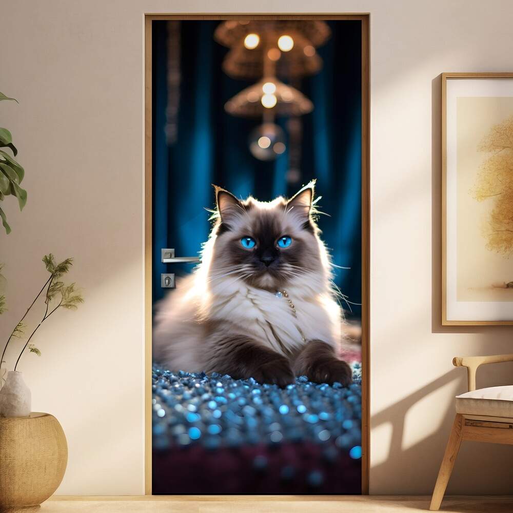 Adesivo de Porta Gato Ragdoll em Ambiente Azul Luxuoso