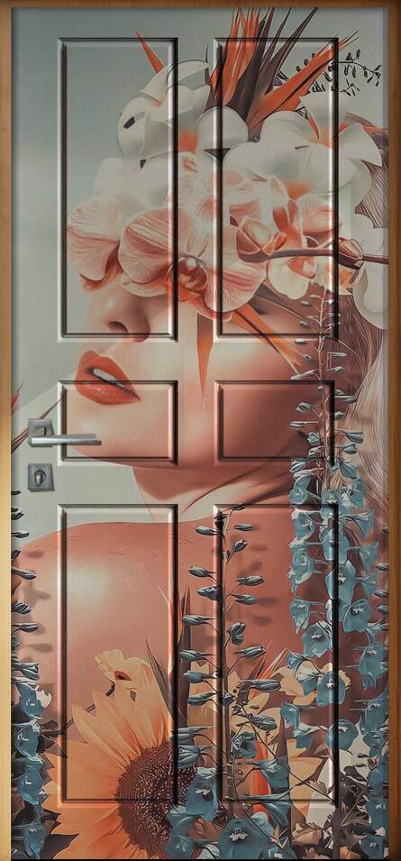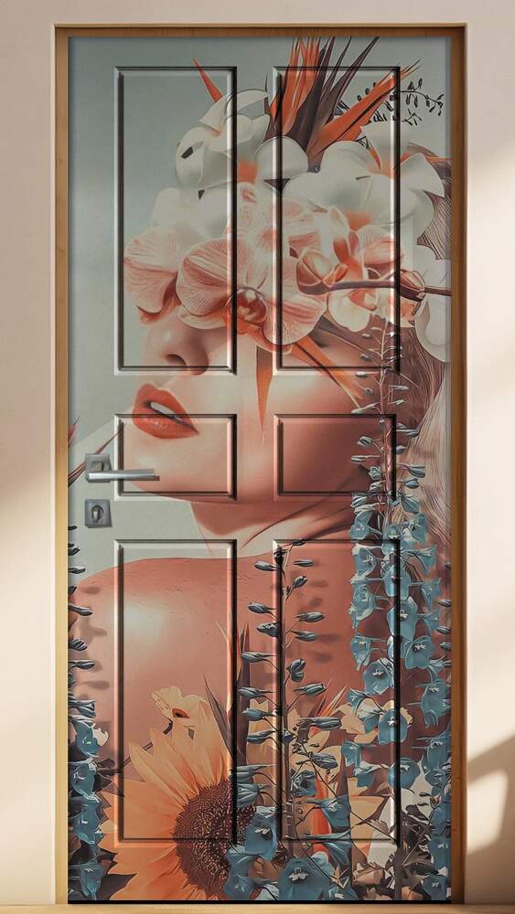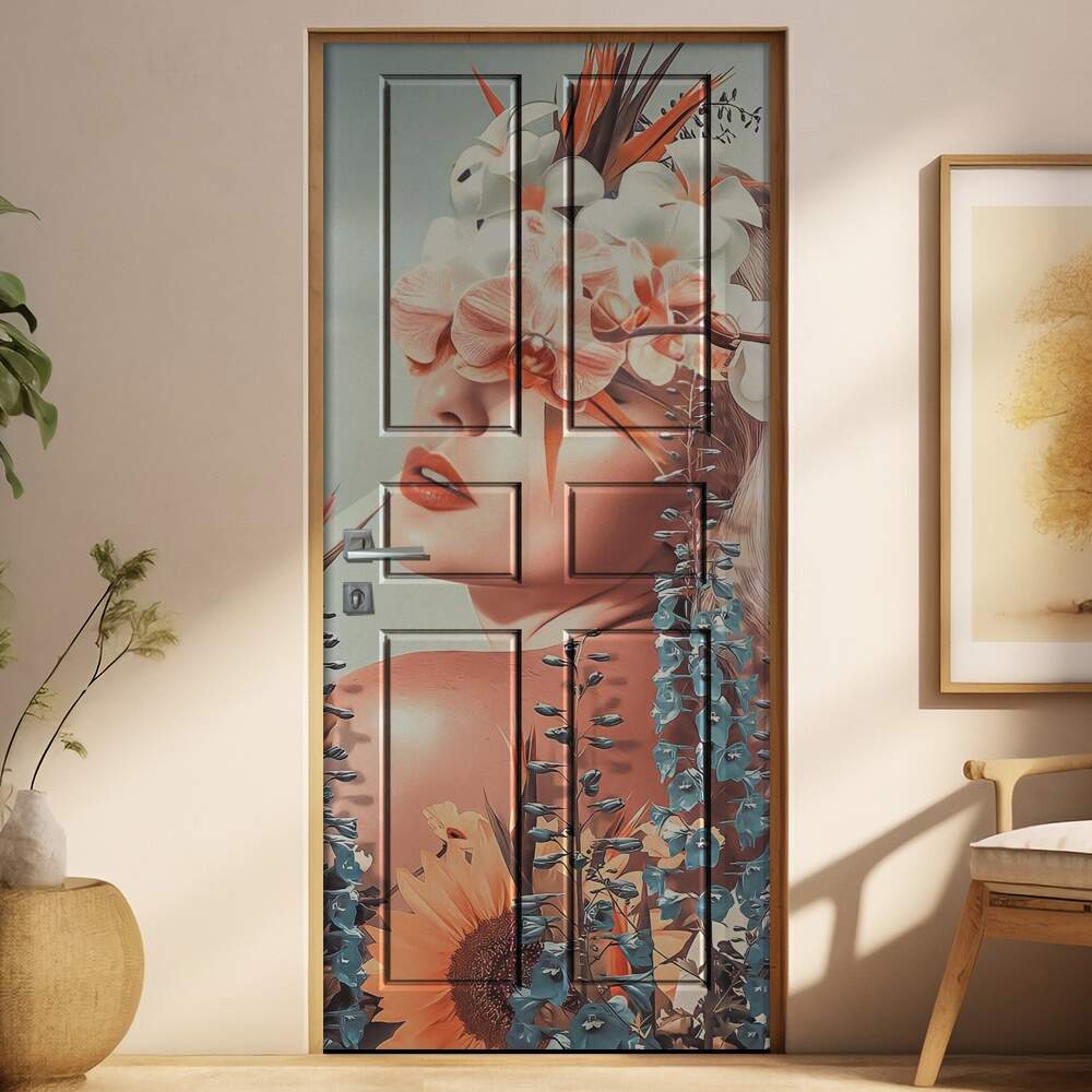 Adesivo Para Porta Abstrato Mulher Com Flores