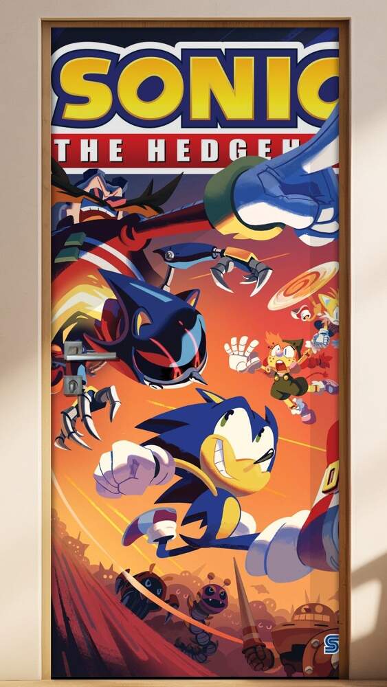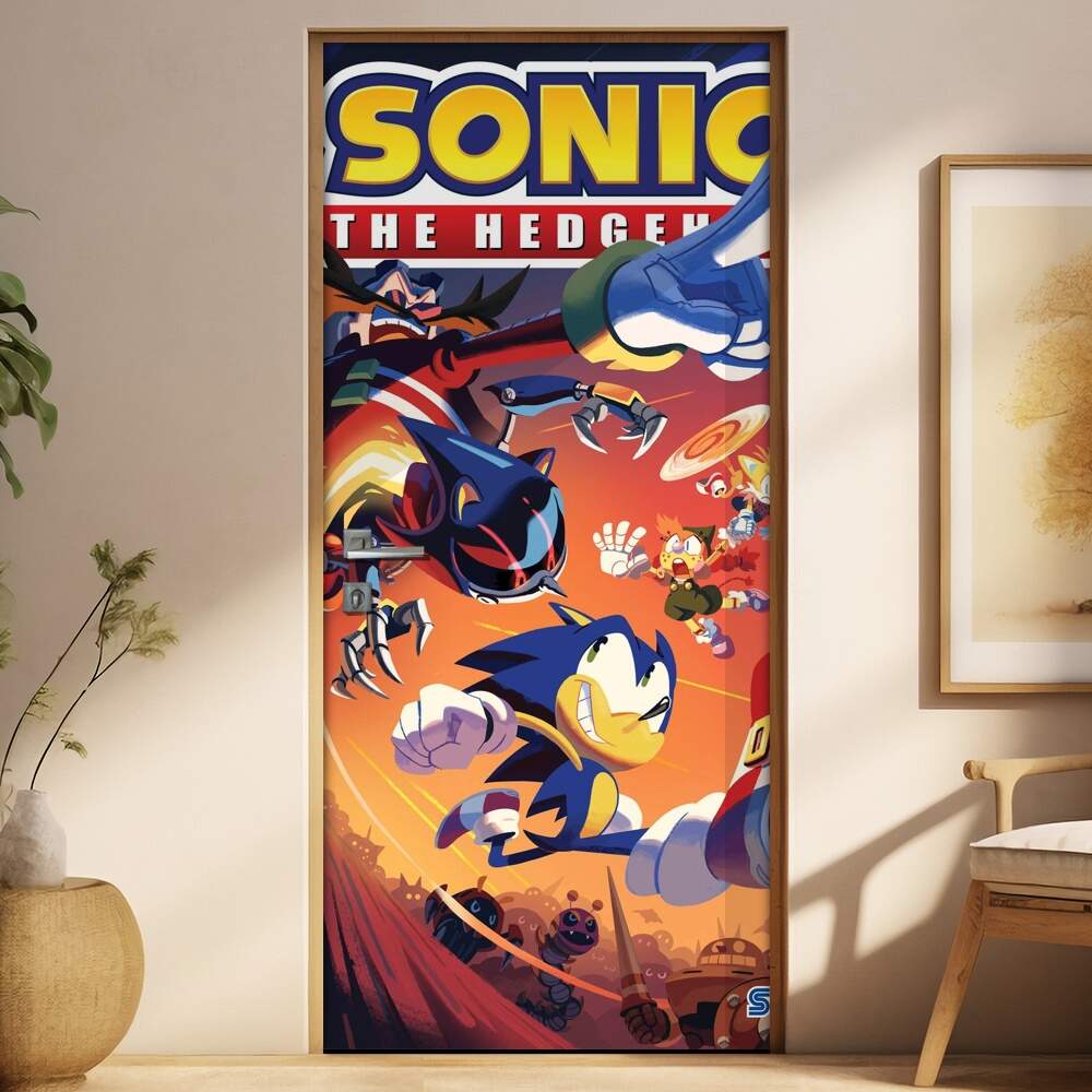 A decoração do quartinho do seu filho está precisando de um upgrade? Não perca mais tempo e decore o cantinho dele com o nosso Adesivo Porta Desenho Sonic e Vilões. Adesivos para portas, adesivos decorativos para portas, adesivos decorativos infantis para portas, decorações infantis, fundo laranja.