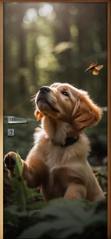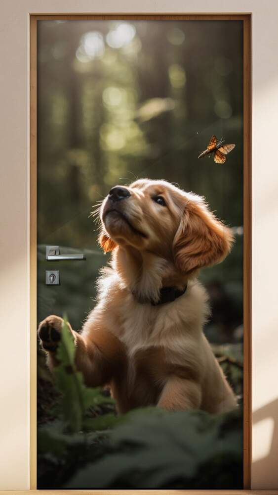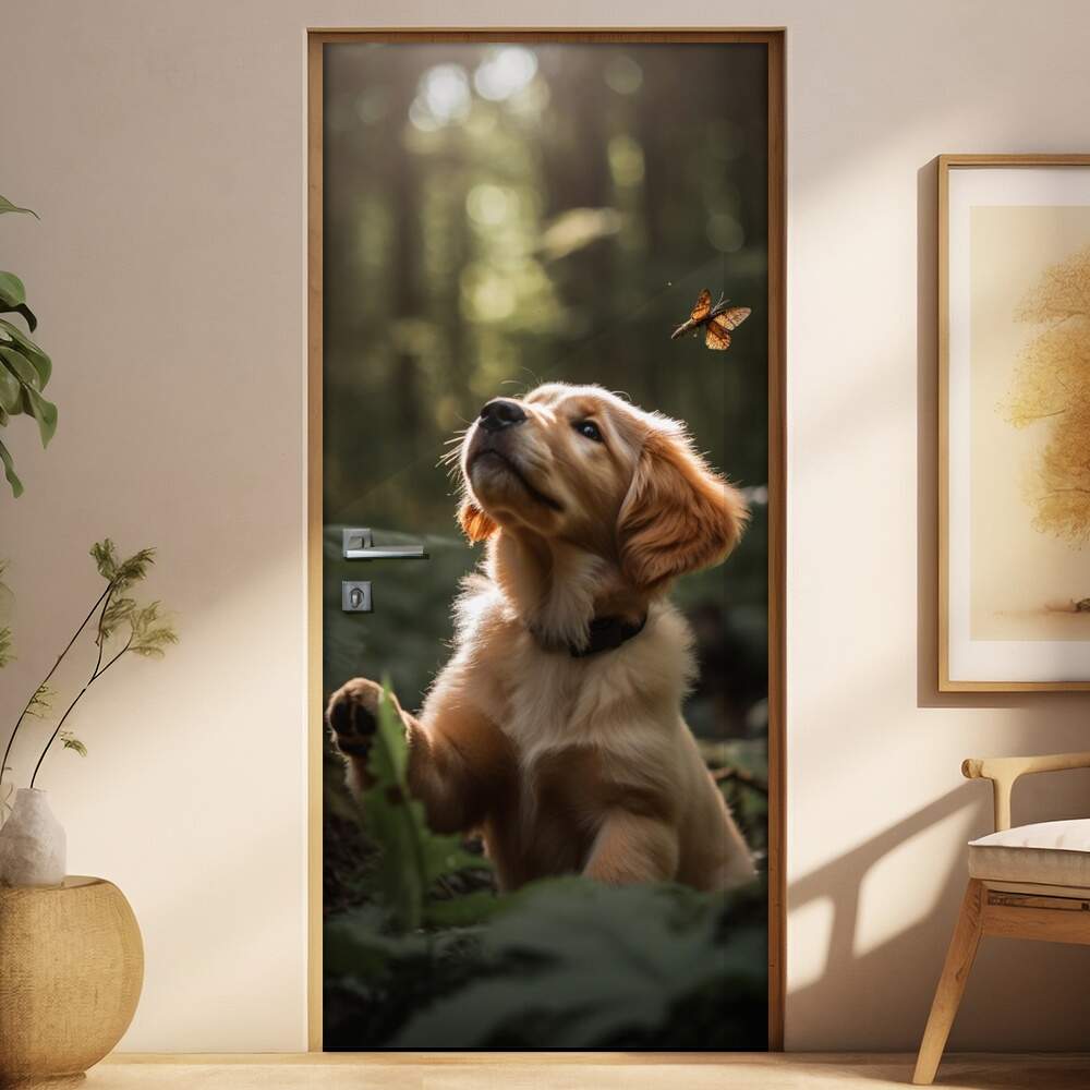 Adesivo Para Porta Fillhote de Golden Brincando na Floresta