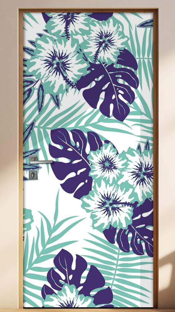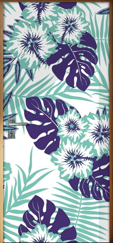 Dê um destaque diferenciado e cheio de personalidade á decoração do seu ambiente com o nosso Adesivo de Porta Folhas Tropicais Azuis que foi criado com um design incrível. Adesivos decorativos de portas, adesivos decorativos de portas folhas tropicais, adesivos de portas flores roxas e verdes.