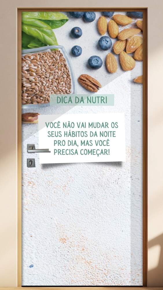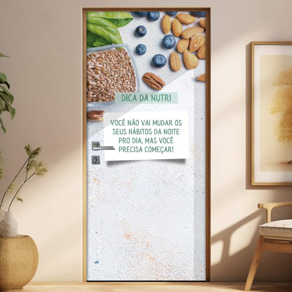Renove a decoração do seu consultório com o Adesivo para Porta para Nutricionista Dica da Nutri. Transmita mensagens inspiradoras aos seus pacientes e reforce a importância da mudança de hábitos alimentares. Com imagens de alimentos saudáveis como sementes, amêndoas, folhas verdes e mirtilos, este adesivo é perfeito para nutricionistas que desejam motivar escolhas mais saudáveis. Transforme a porta do seu espaço em um lembrete positivo e acolhedor para todos que entram.