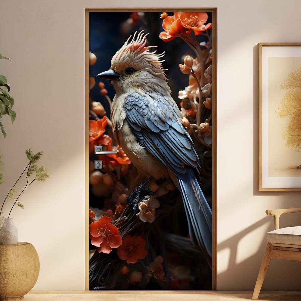 Adesivo Para Porta Passarinho Entre Flores Laranjas