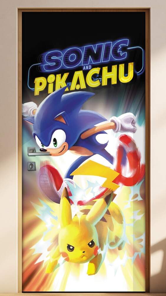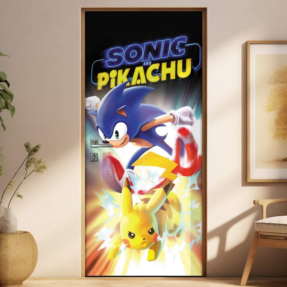 O nosso Adesivo Porta Sonic e Pikachu é perfeito para as mamães ou papais decorarem o quartinho de seus pequenos, afinal, é o espaço que eles mais ficam. Adesivos para portas, adesivos decorativos para portas, adesivos decorativos para portas infantis, decorações infantis, fundo preto.