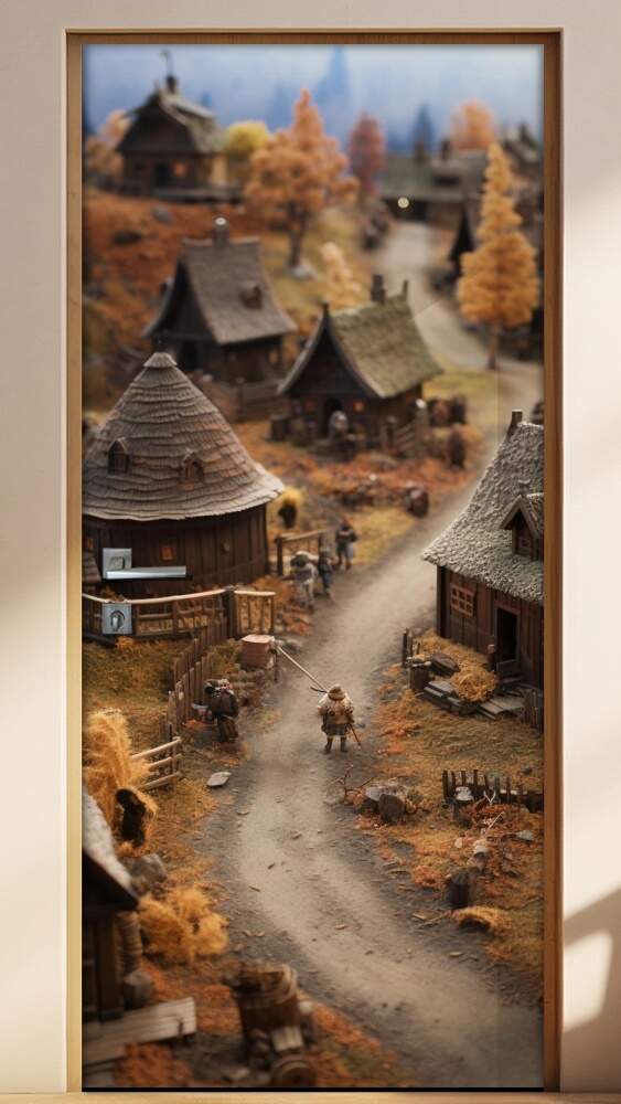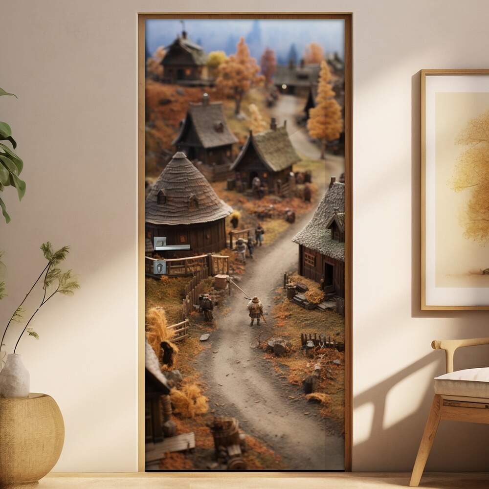 Transforme a entrada da sua casa em um autêntico vilarejo viking com este magnífico adesivo para porta. A maquete capta com perfeição a essência desse período histórico, com casas tradicionais de telhados de palha, um caminho central e figuras vestidas com trajes típicos da época. Deixe-se envolver pelo charme, aconchego e aventura que esse adesivo proporciona, trazendo toda a magia dos vikings diretamente para o seu lar.
