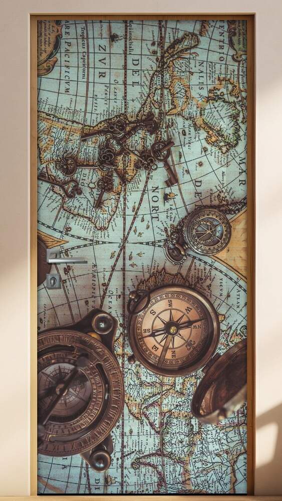 Adesivo Para Porta Retro Bússola E Mapa 02