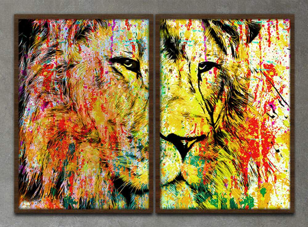 Kit 2 Quadros Decorativos Abstratos Leão Pintura Colorida