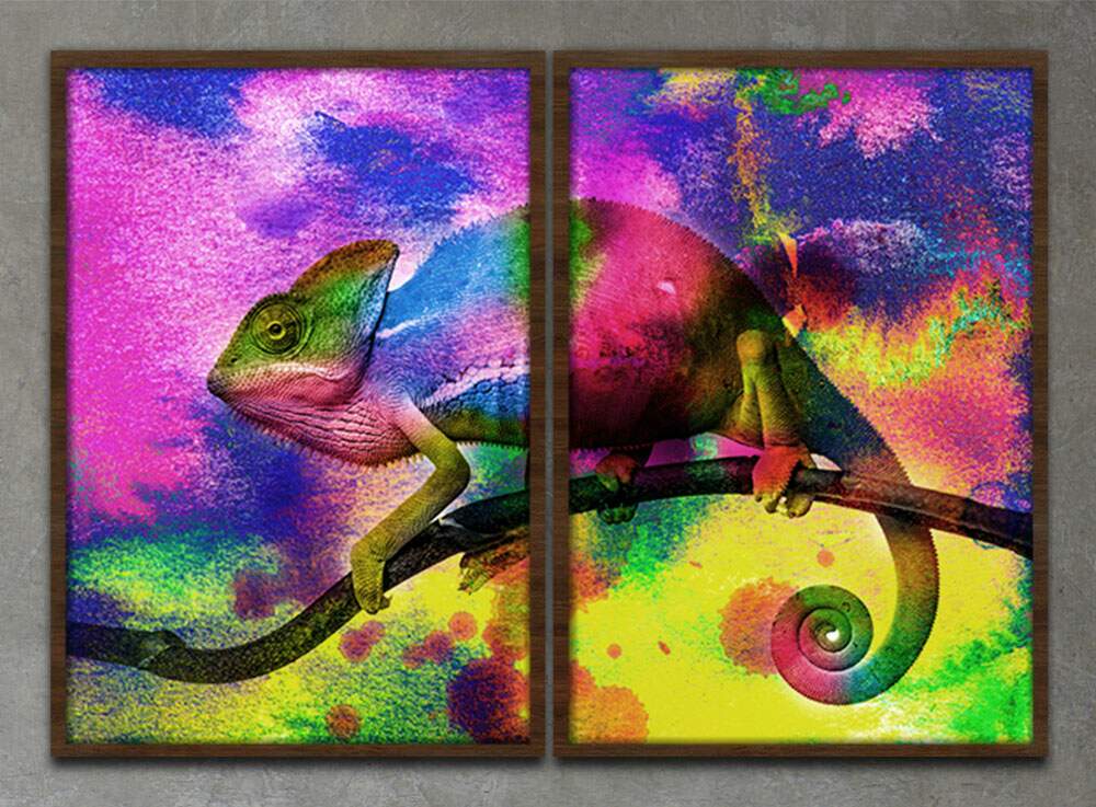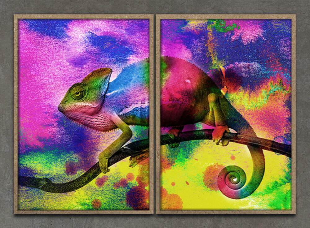 Kit 2 Quadros Decorativos Pintura Camaleão Colorido