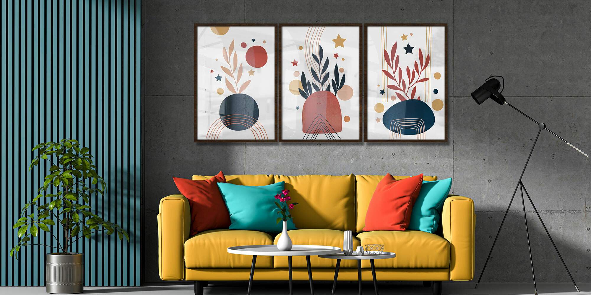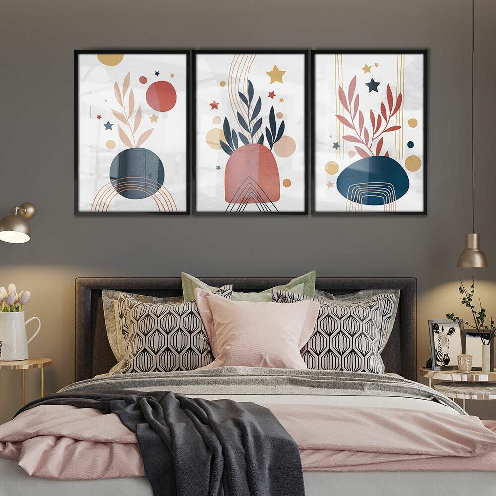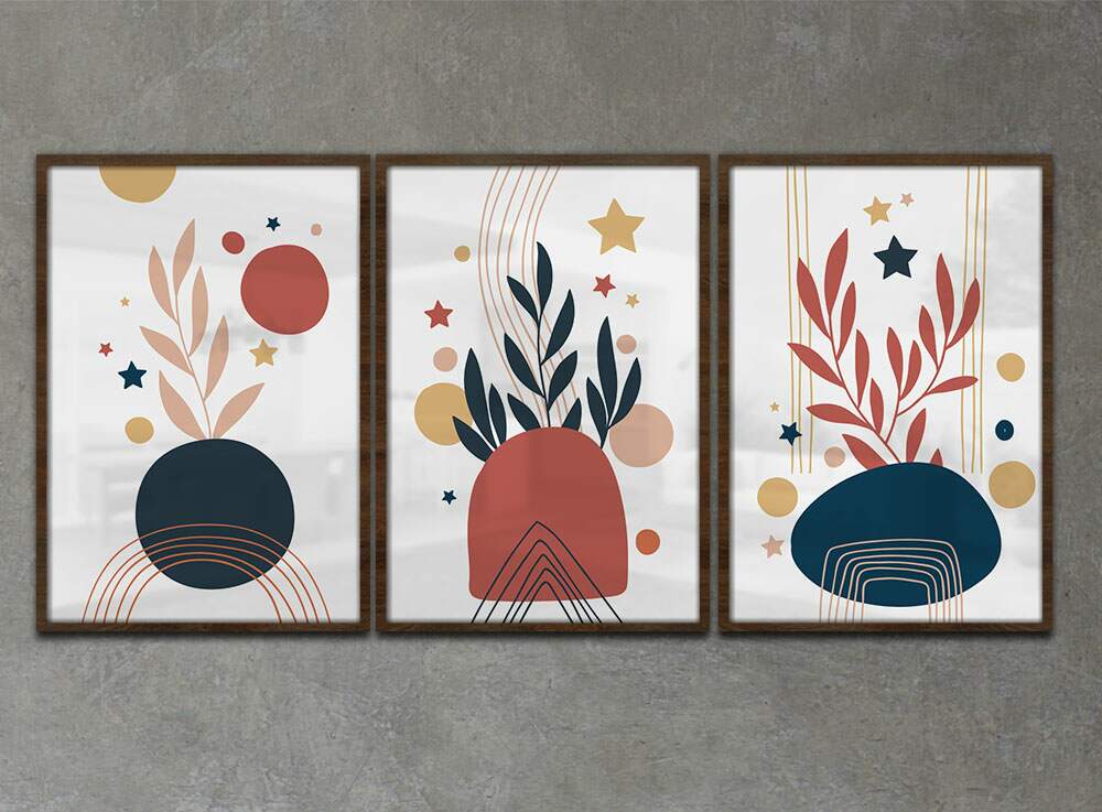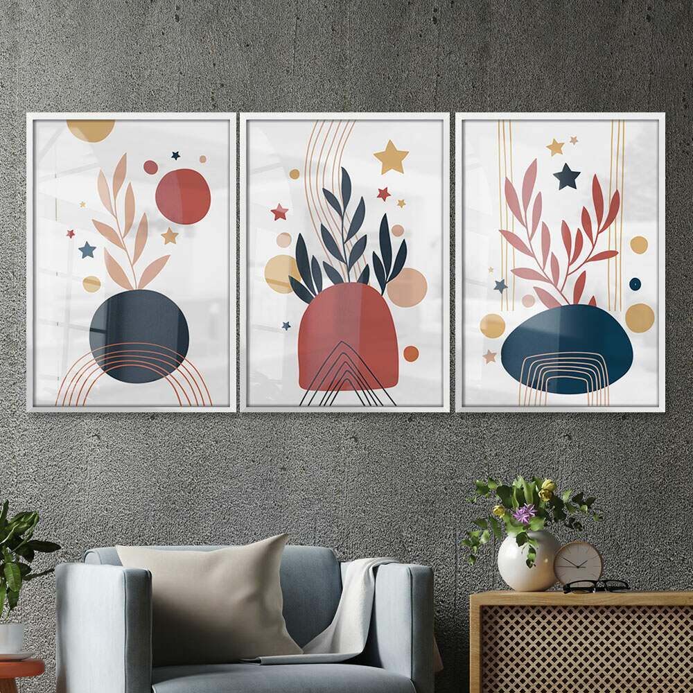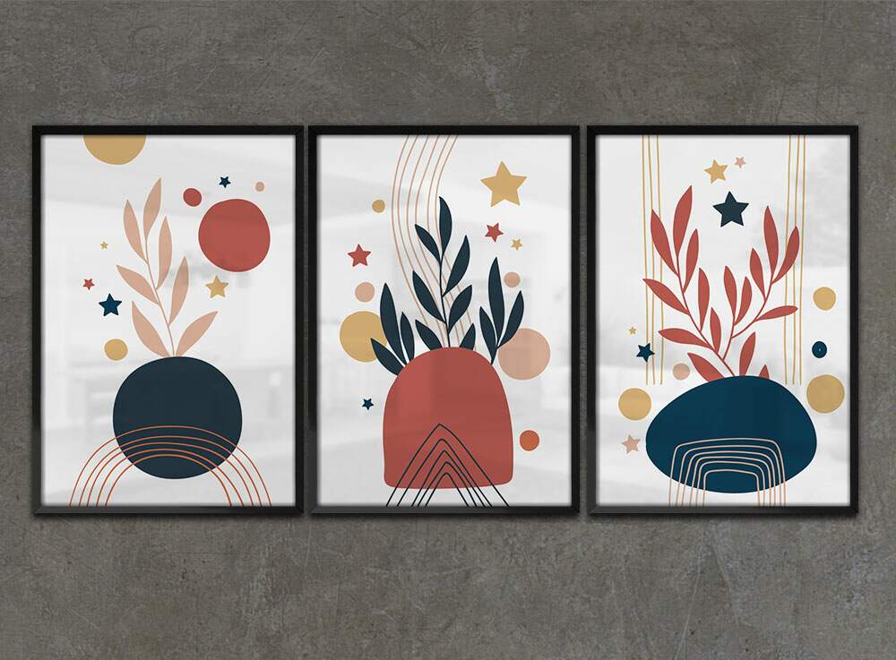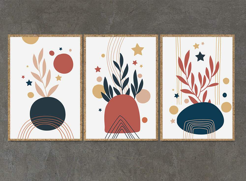 Kit 3 Quadros Decorativos Abstrato Folhagem Azul e Vermelha
