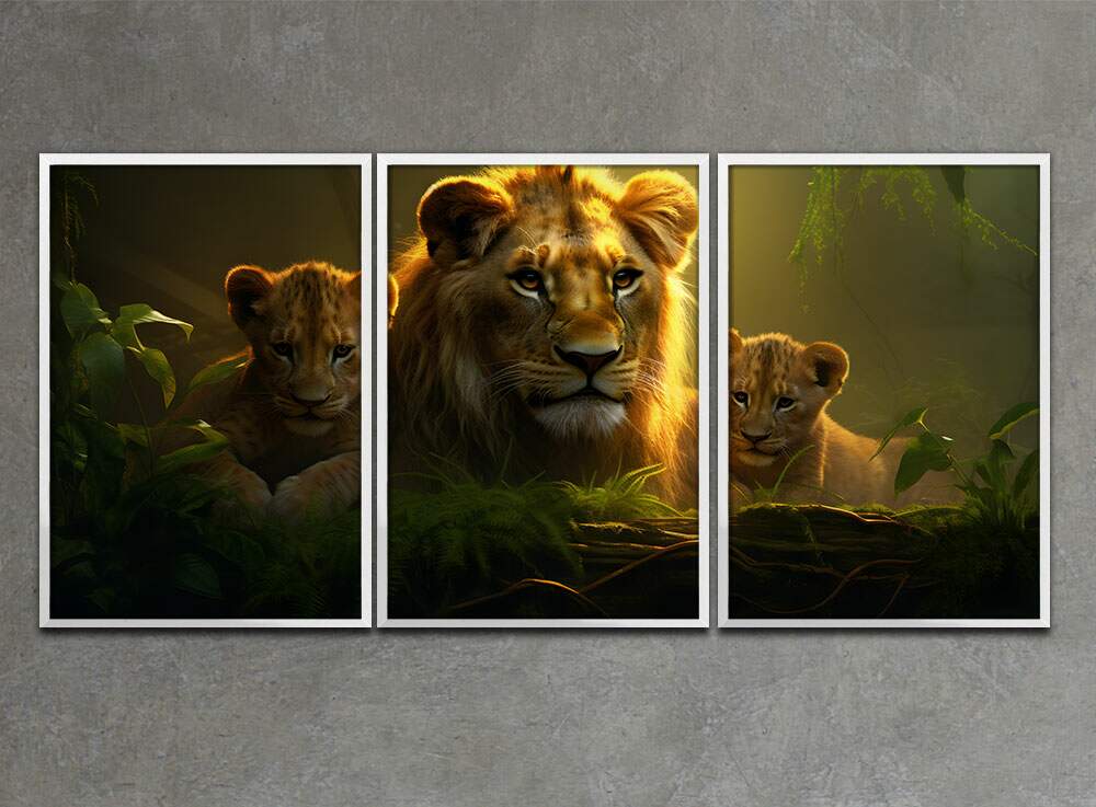 Kit 3 Quadros Decorativos Família Leonina na Selva