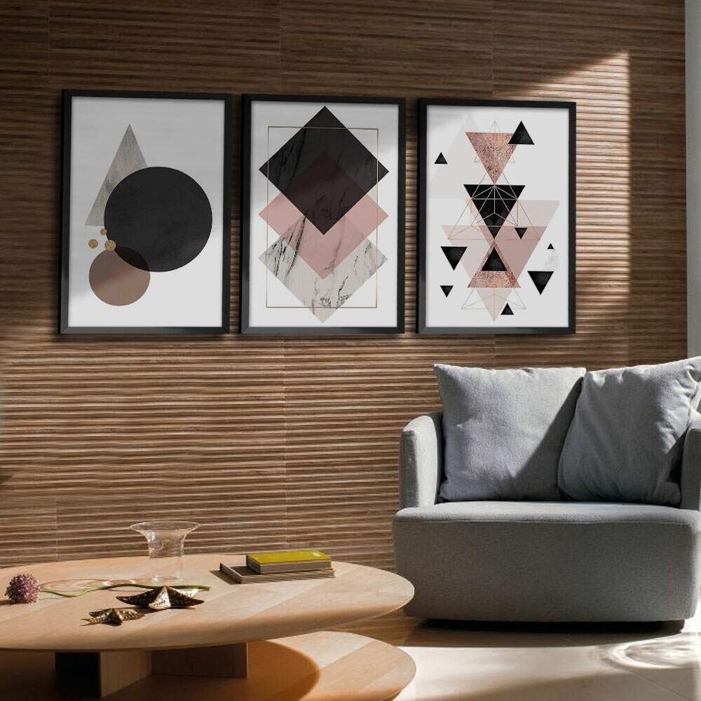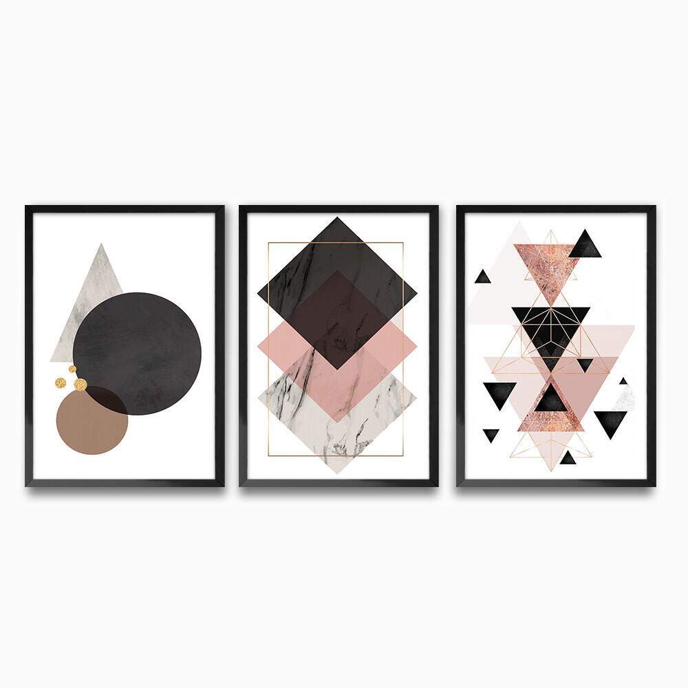 Kit 3 Quadros Decorativos Geométricos Rose Mármore com Dourado