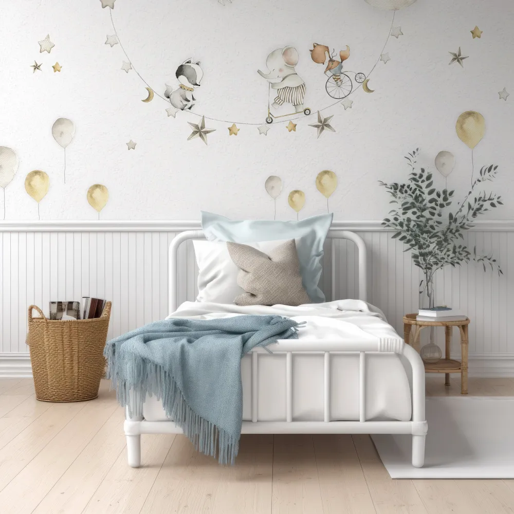 Transforme o quarto do seu bebê em um refúgio encantado com o Papel de Parede Animais de Berço. Esta obra de arte em aquarela apresenta adoráveis animais como elefante, raposa, coelho e pássaro, rodeados por um céu estrelado em tons de branco e dourado. A lua sorridente e os balões dourados e prateados adicionam um toque de magia ao ambiente, tornando-o perfeito para um espaço de sonho e tranquilidade.
