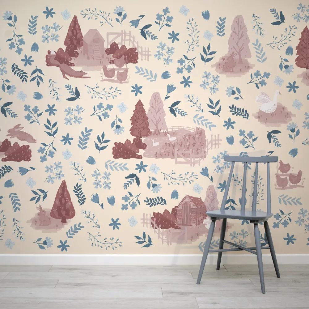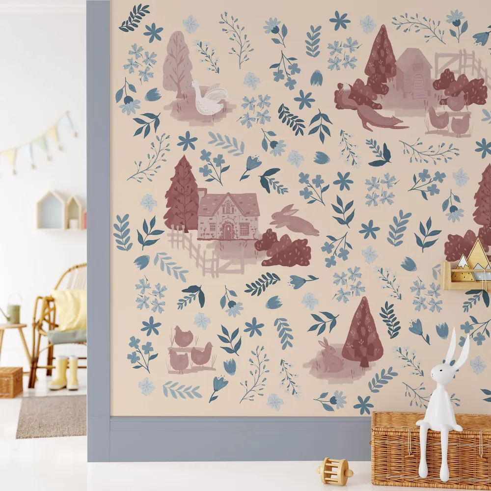 Transforme seu ambiente em uma cena encantadora da natureza com este adorável papel de parede de animais do campo. Com ilustrações lúdicas e cheias de charme, apresenta coelhos, raposas e gansos em tons de vermelho e azul, criando uma atmosfera tranquila e divertida. Ideal para complementar a decoração de móveis estilo cottage-core, trazendo um toque especial e acolhedor ao quarto das crianças.