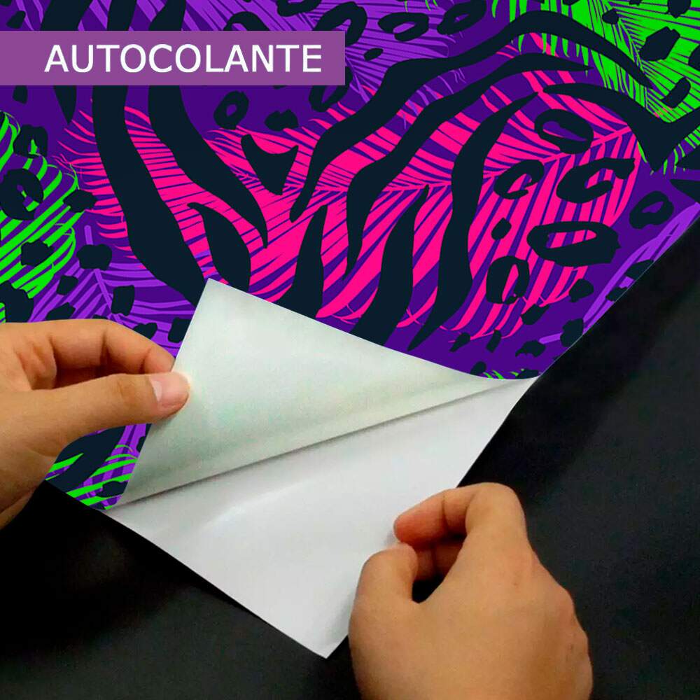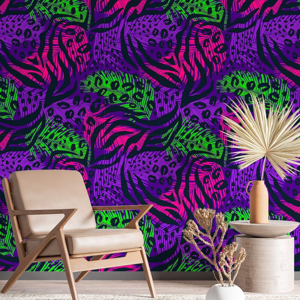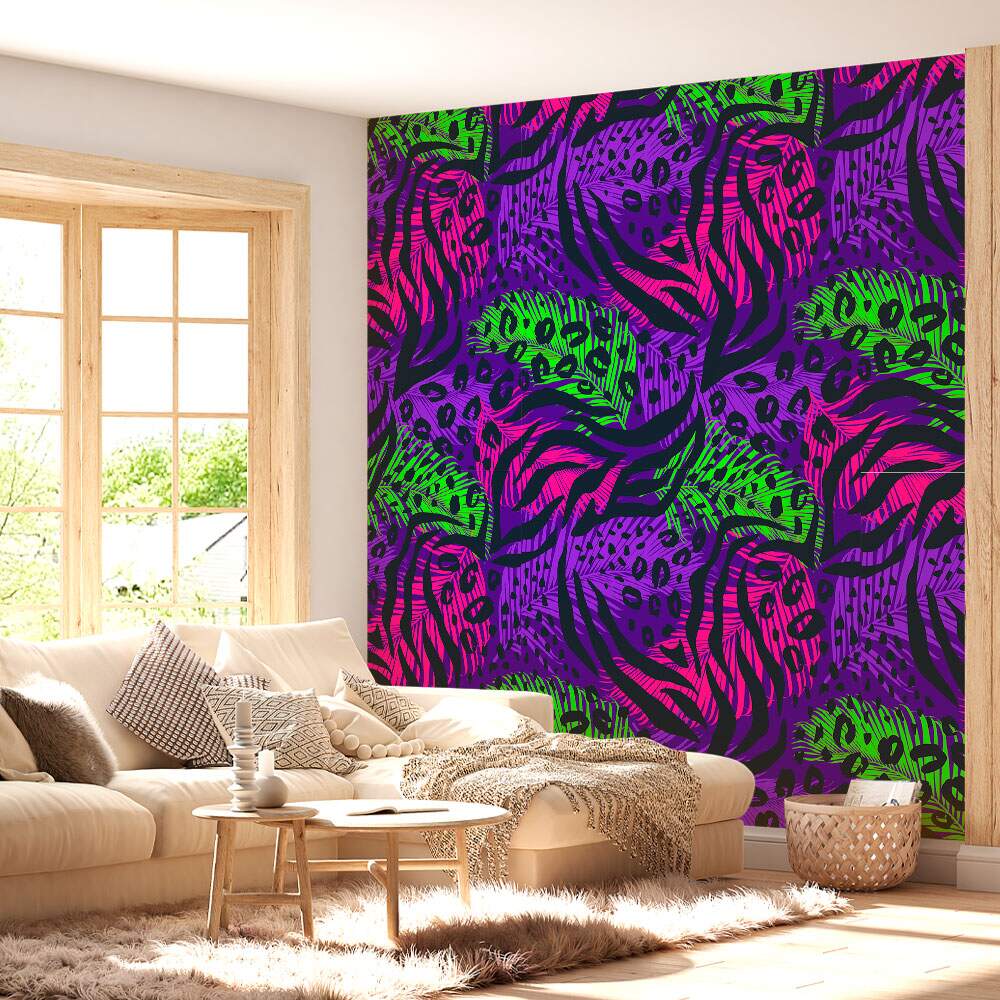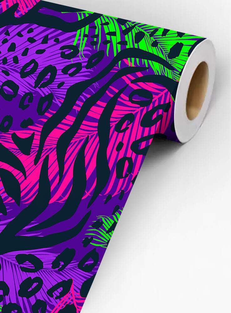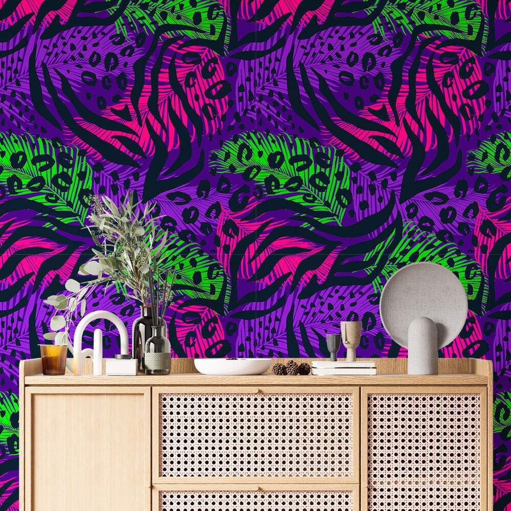 Transforme o seu espaço em um ambiente vibrante e exótico com o Papel de Parede Animal Print Tropical Cores Florescentes. Os padrões de animal print se misturam a folhas tropicais em tons de verde, roxo e rosa, criando uma atmosfera moderna e dinâmica. Renove sua parede sem graça em poucos minutos e traga a energia da fauna tropical para dentro da sua casa. Desperte a ousadia e alegria da natureza em cada cantinho do seu lar com esse papel de parede autocolante e cheio de personalidade.