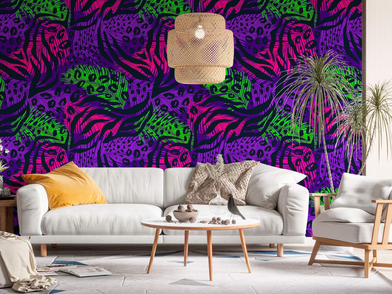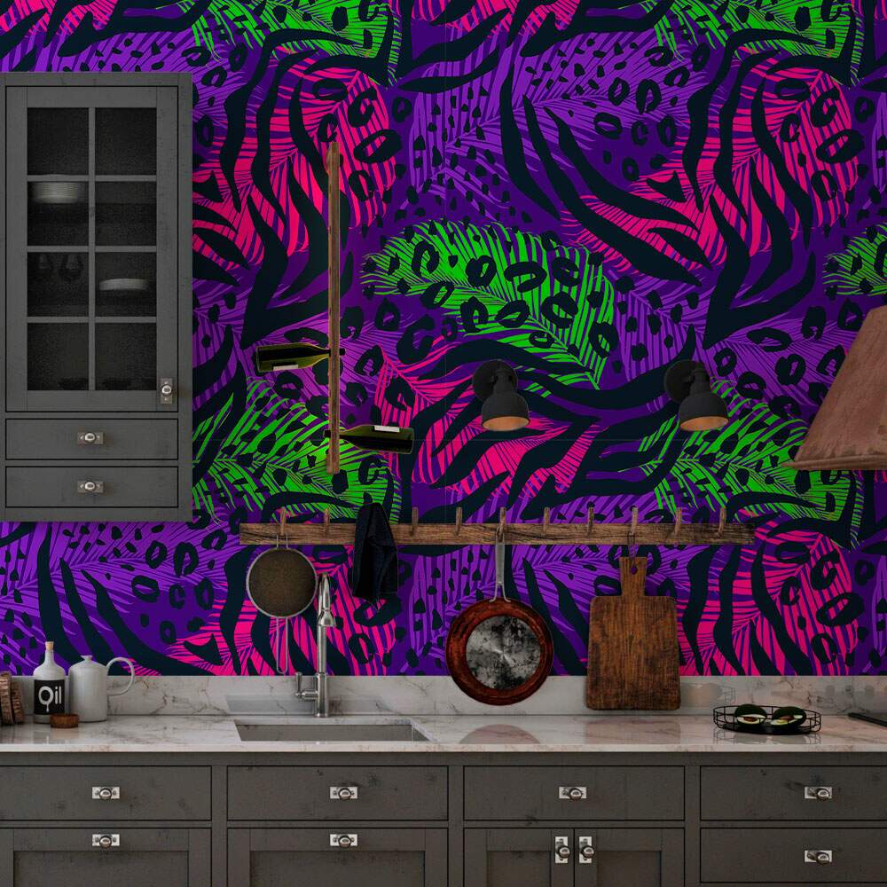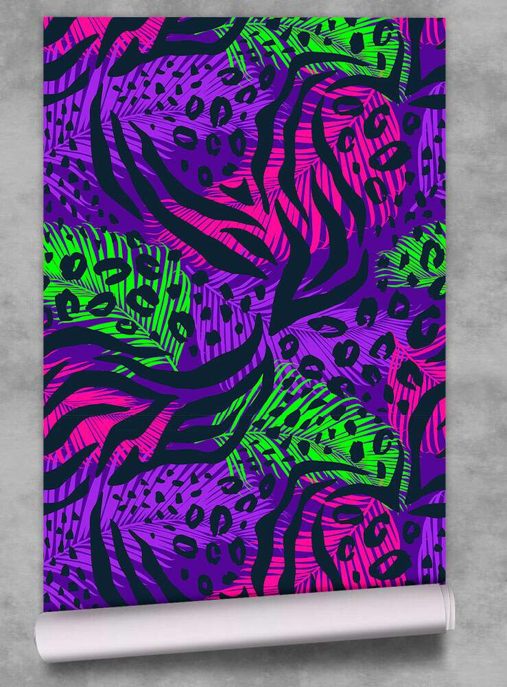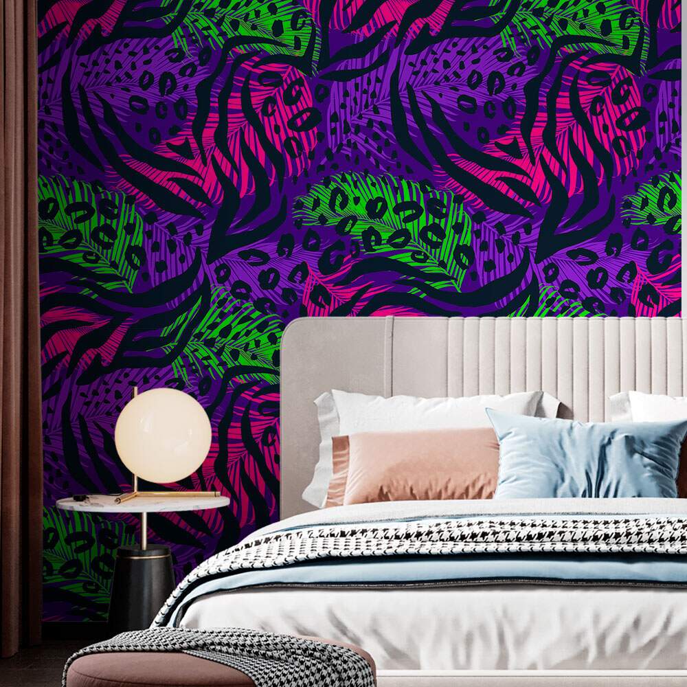 Transforme o seu espaço em um ambiente vibrante e exótico com o Papel de Parede Animal Print Tropical Cores Florescentes. Os padrões de animal print se misturam a folhas tropicais em tons de verde, roxo e rosa, criando uma atmosfera moderna e dinâmica. Renove sua parede sem graça em poucos minutos e traga a energia da fauna tropical para dentro da sua casa. Desperte a ousadia e alegria da natureza em cada cantinho do seu lar com esse papel de parede autocolante e cheio de personalidade.