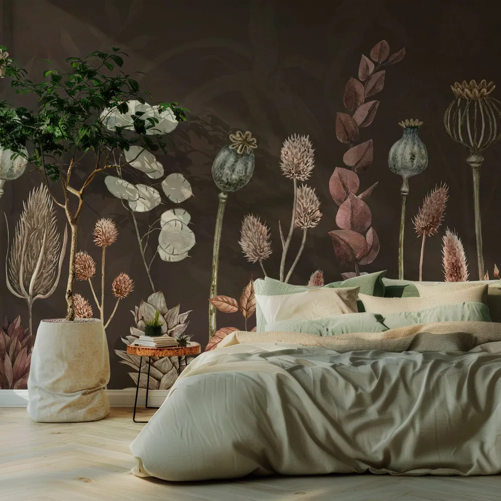 O Papel de Parede Aquarela Botânica Marrom apresenta ilustrações botânicas detalhadas em um fundo marrom escuro, ideal para transformar seu ambiente em um espaço acolhedor e convidativo. Com uma paleta de cores outonais, este design harmoniza perfeitamente com móveis escuros e materiais naturais, tornando-se uma escolha marcante para salas de jantar ou estar.