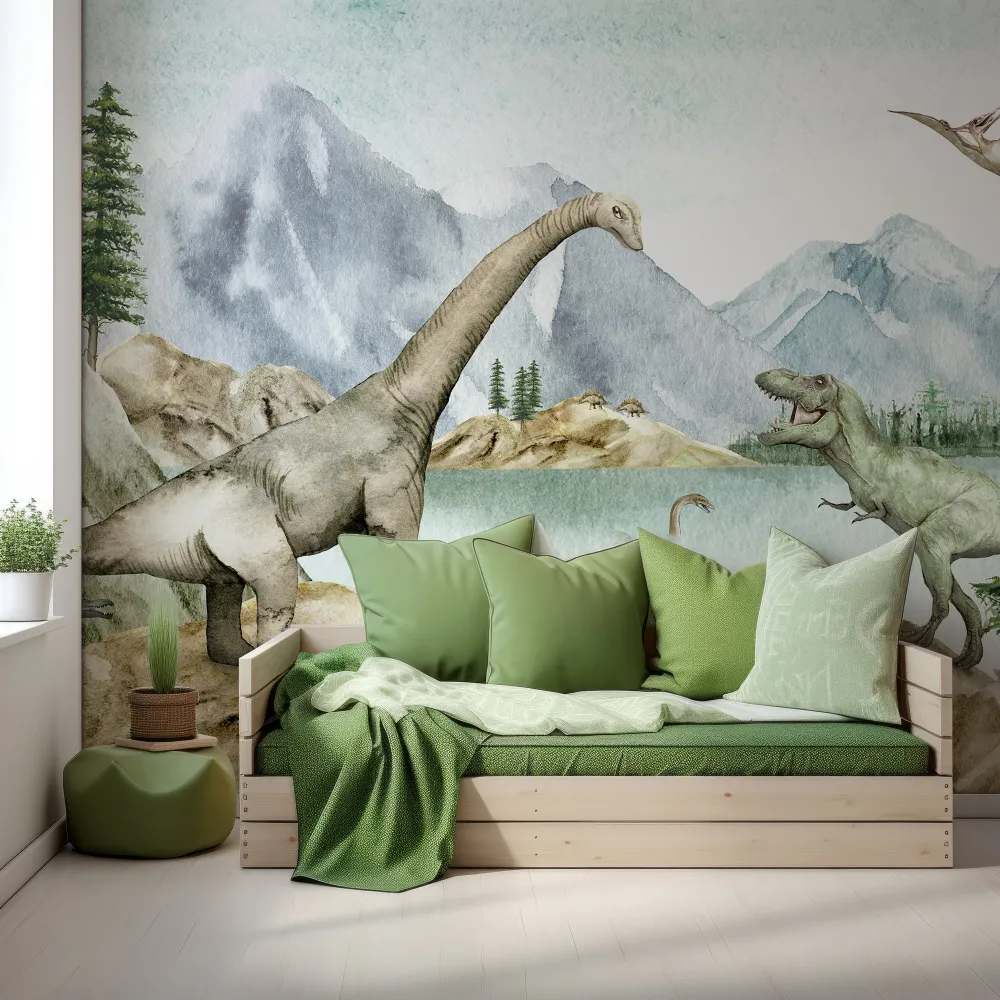 Transforme o quarto do seu pequeno amante de dinossauros com este incrível papel de parede! O design aquarelado traz à vida um mundo pré-histórico repleto de dinossauros divertidos, como o elegante Brachiosaurus, o voador Pterodactyl e o poderoso Tiranossauro Rex. Com cores vibrantes e uma cena encantadora, este mural proporciona um ambiente mágico, estimulando a imaginação e as aventuras dos pequenos. Uma escolha perfeita para quem deseja criar um espaço único e cheio de alegria!