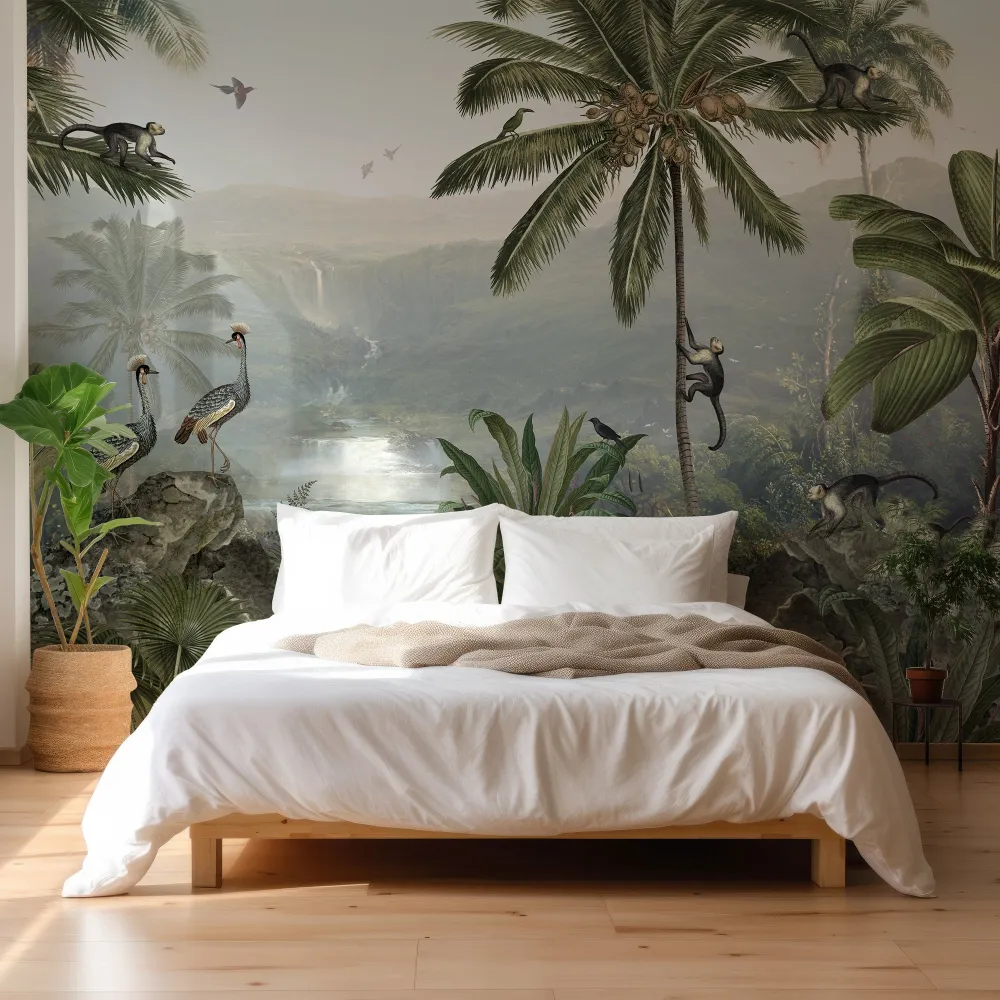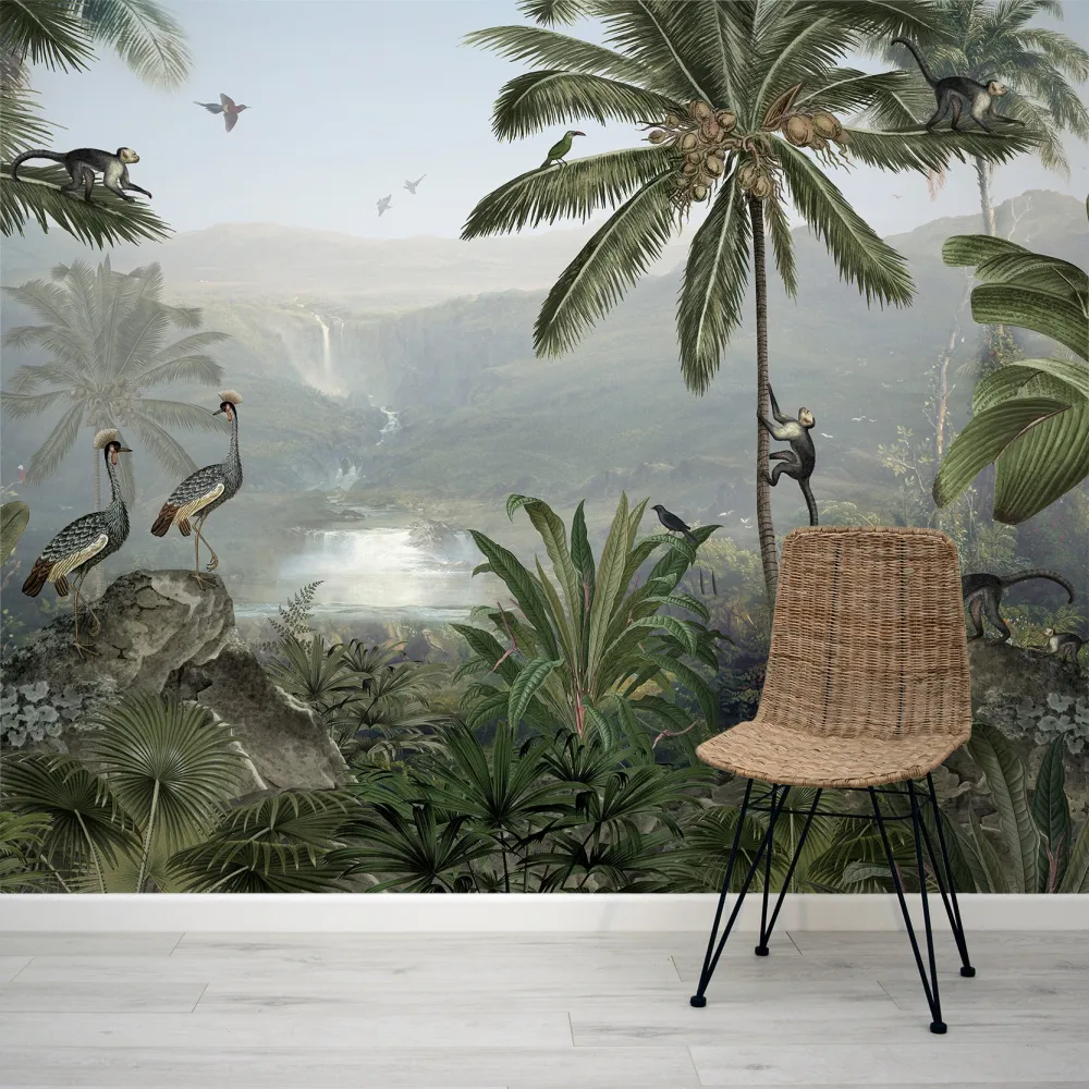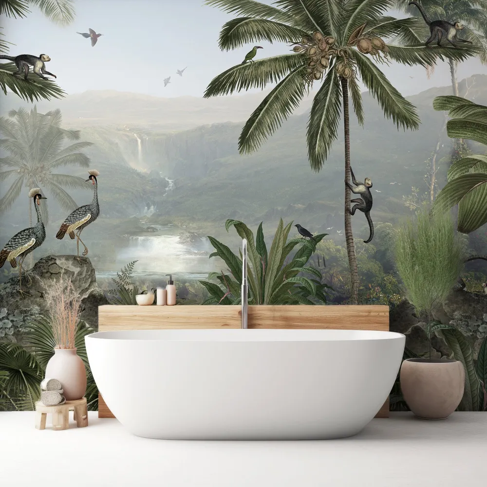 Transforme seu ambiente com o Papel de Parede Aquarela Pássaros Exóticos na Selva. Este mural vibrante apresenta uma rica selva tropical repleta de pássaros exóticos e uma vegetação exuberante. Deixe-se levar pela tranquilidade das vistas montanhosas, palmeiras e a beleza da flora que traz a natureza para dentro do seu espaço.