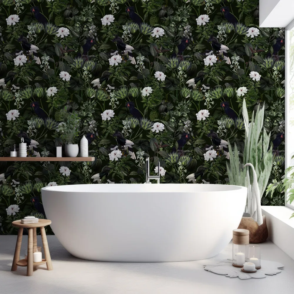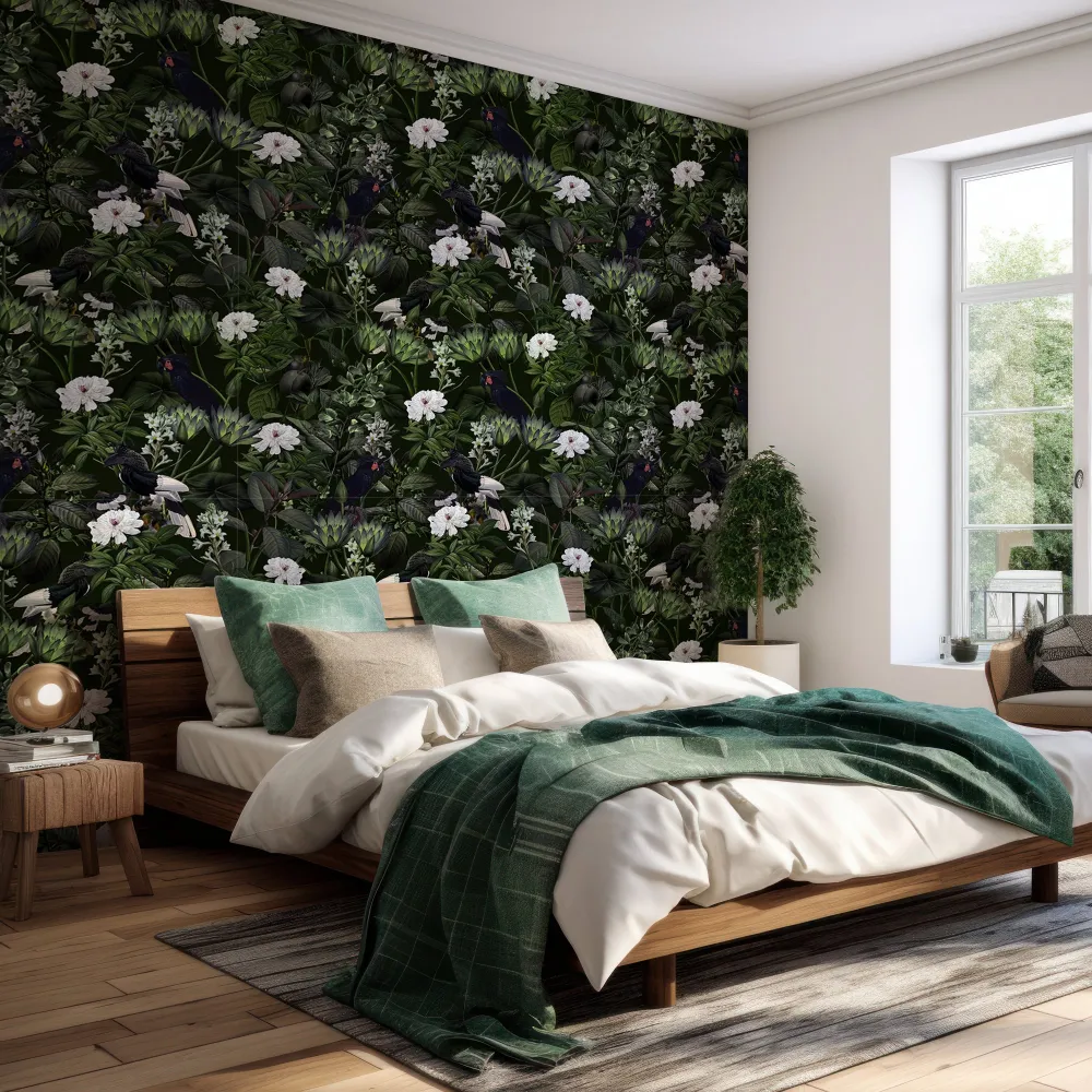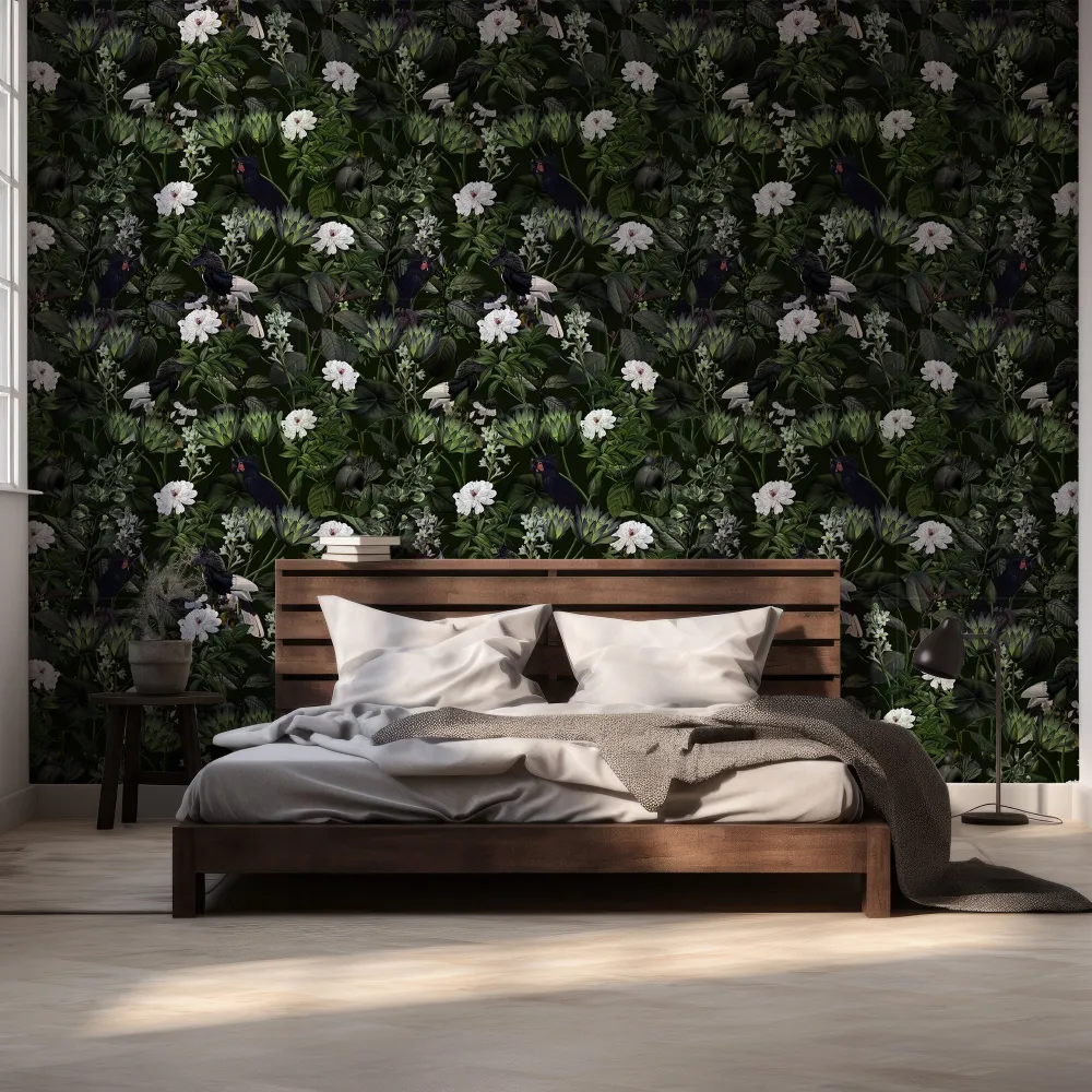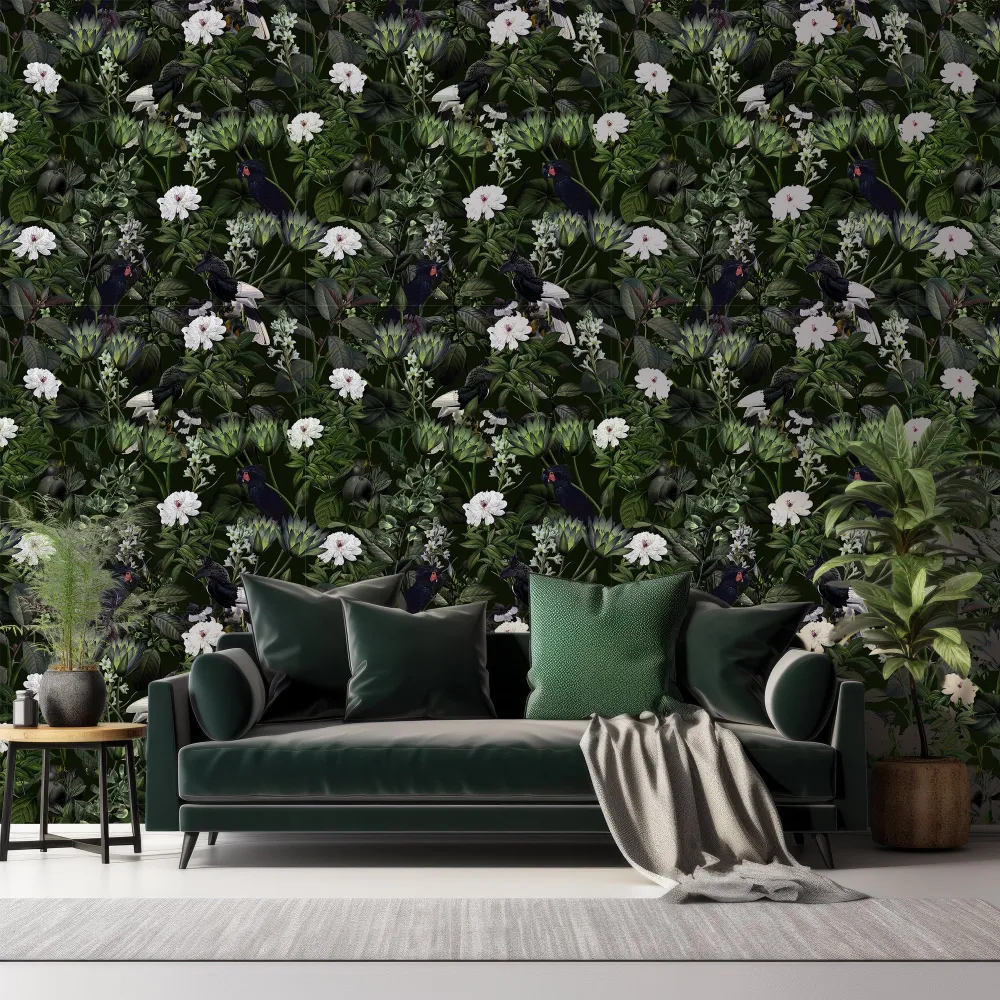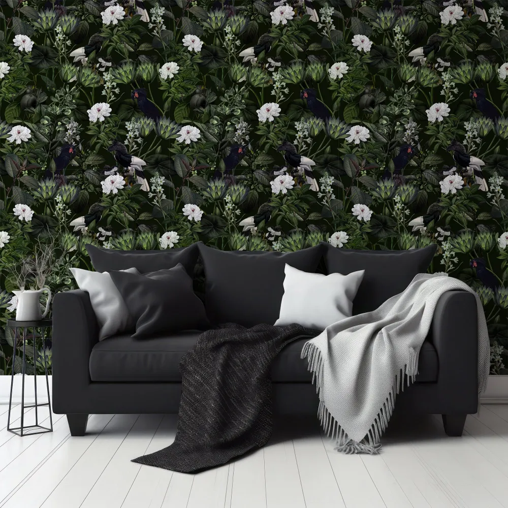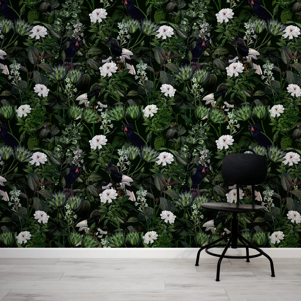 Papel de Parede Araras Negras e Flores Brancas na Selva MP
