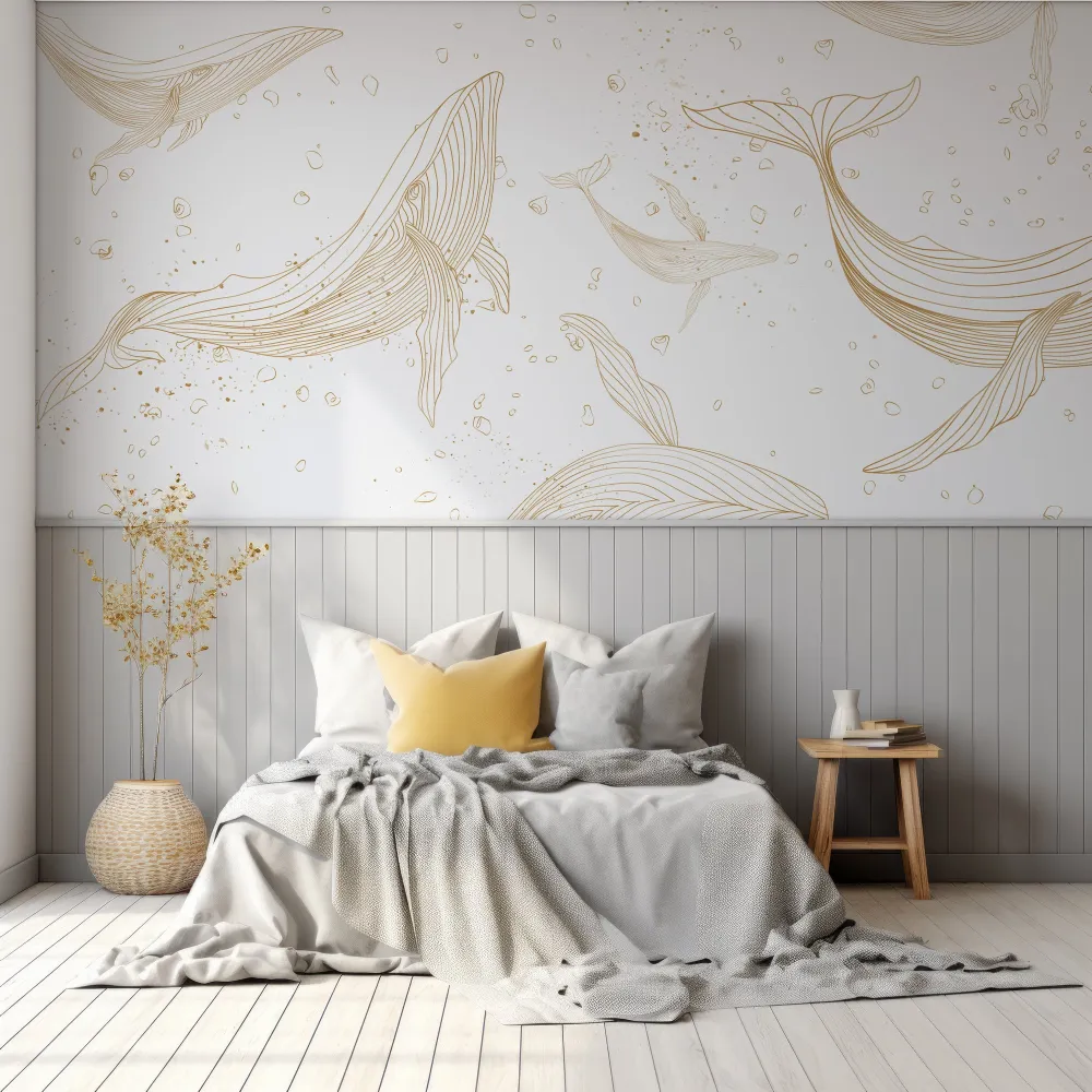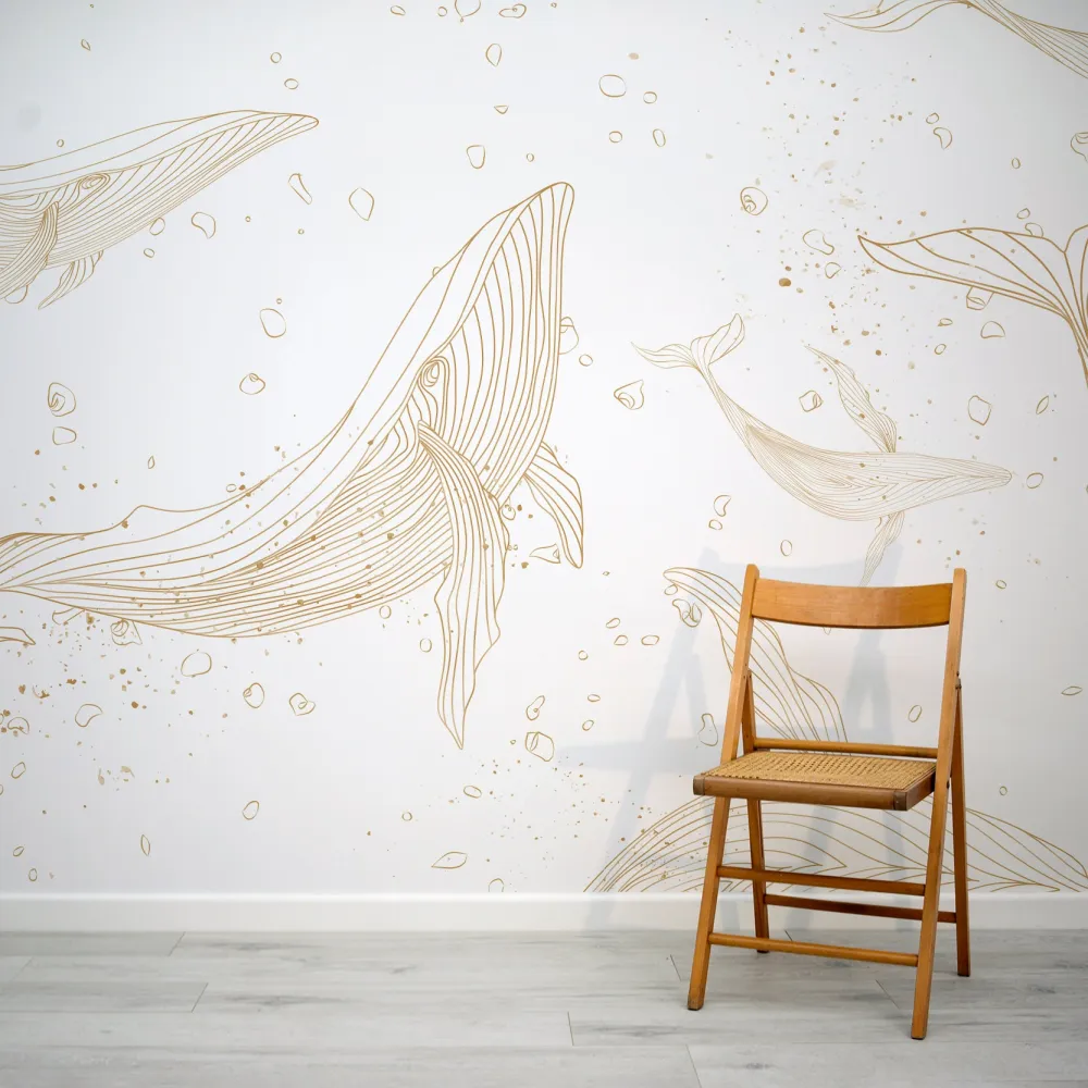 Transforme o ambiente do seu filho com o Papel de Parede Baleias Douradas do Oceano. Este papel apresenta desenhos minimalistas de baleias em traços dourados, flutuando suavemente em um fundo branco. Pequenas bolhas encantam o cenário, trazendo um toque lúdico e náutico ao quarto. Ideal para quem busca uma decoração que combine sofisticação e diversão, esse mural traz a magia do oceano para qualquer espaço infantil.