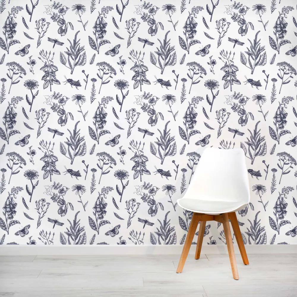 Transforme seu ambiente com o Papel de Parede Botânico Azul Marinho! Este mural impressionante apresenta ilustrações botânicas em azul marinho, adornadas com desenhos delicados de plantas e insetos sobre um fundo branco contrastante. Sua paleta de cores suaves permite que esta obra complemente diversos estilos de decoração, trazendo um toque clássico e sofisticado a qualquer espaço. Ideal para ambientes no estilo fazenda ou para enriquecer uma parede de destaque.