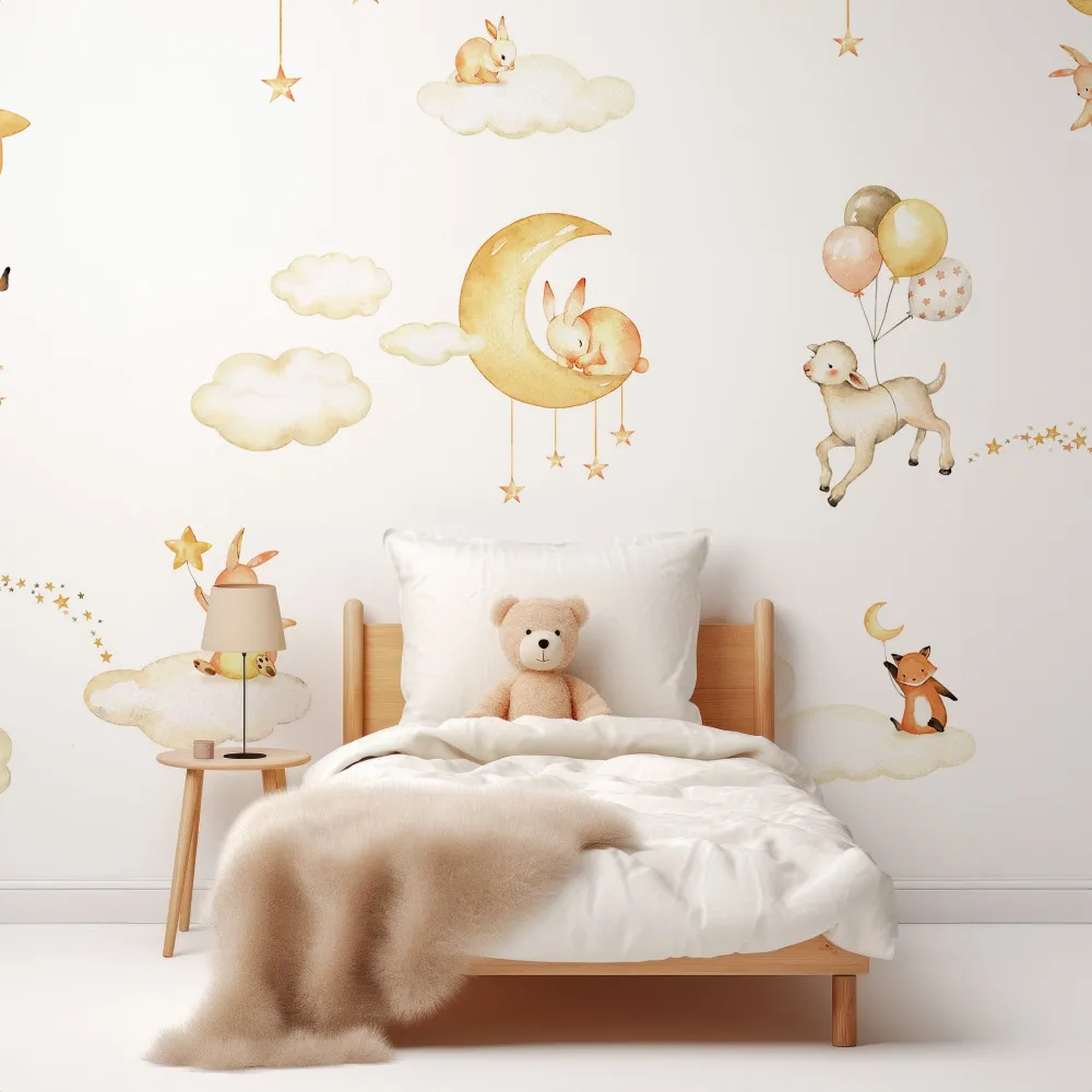 Transforme o quarto do seu bebê em um refúgio tranquilo com o Papel de Parede Céu Dourado com Animais Noturnos. Este design encantador apresenta adoráveis animais aquarelados, como raposas, coelhinhos e cordeirinhos, repousando sobre nuvens fofas, rodeados por estrelas e luas douradas. As cores suaves e a estética minimalista criam uma atmosfera relaxante, perfeita para embalar os sonhos do seu pequeno.