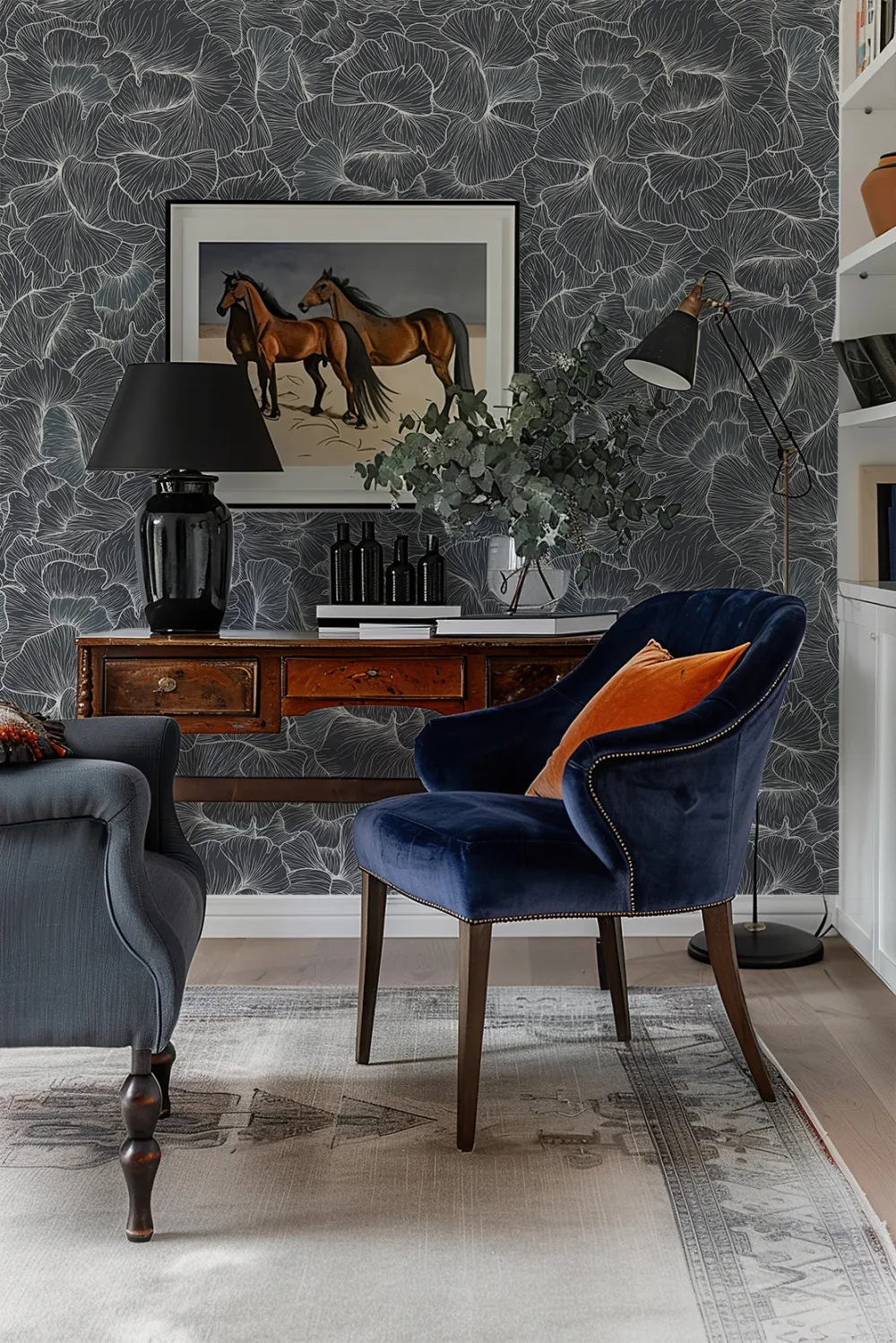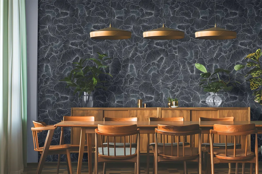 O Papel de Parede Chanterelle Azul Linework traz um padrão sofisticado em um tom profundo de azul, desenhado à mão com linhas finas e detalhadas. Ideal para quem aprecia a arte e deseja um toque elegante em qualquer ambiente. Combine com elementos em madeira aquecida e texturas de veludo para criar uma atmosfera opulenta e refinada.