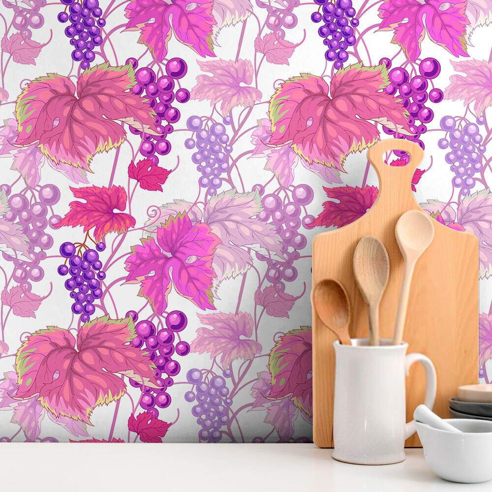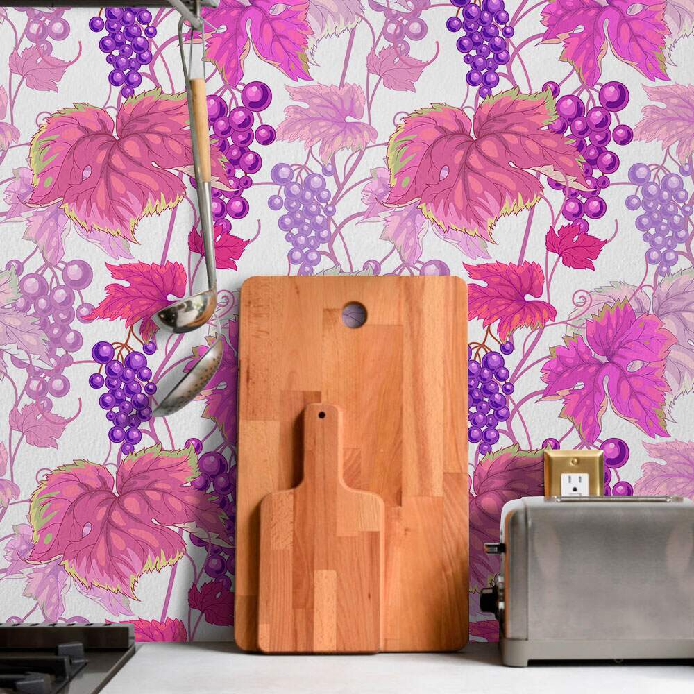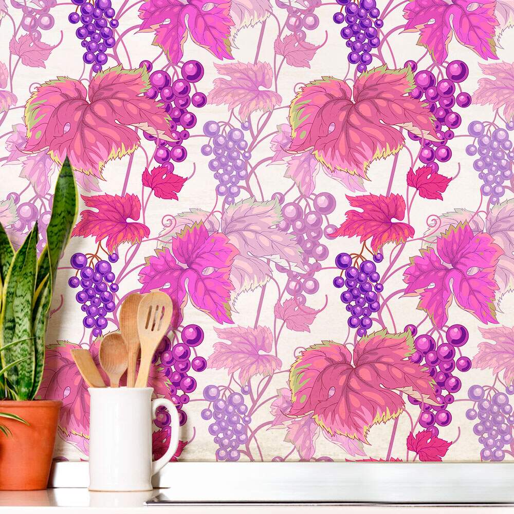 Papel de Parede Cozinha Uvas com Folhas Rosas
