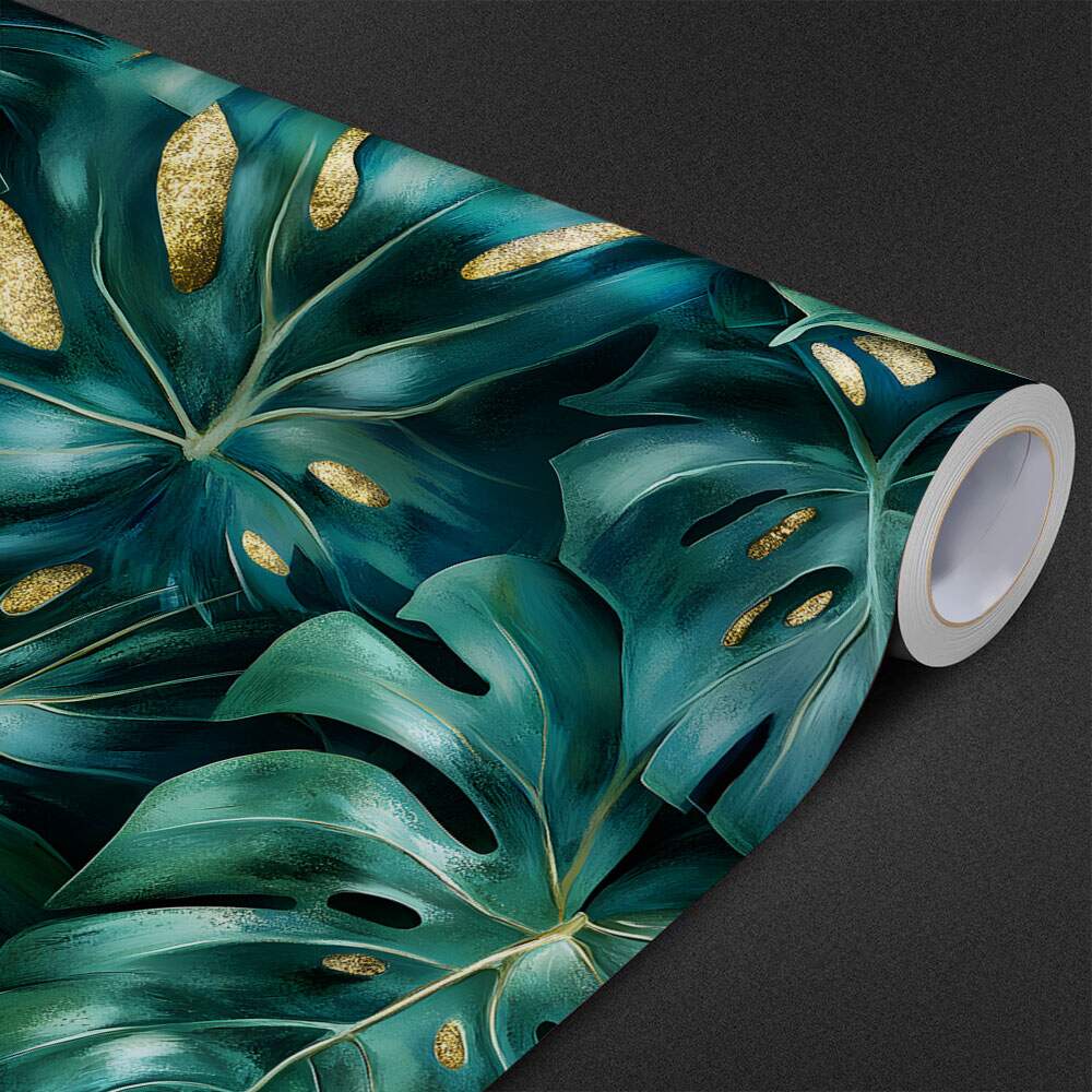 Papel de Parede Floral Folhas Monstera com Detalhes Dourados