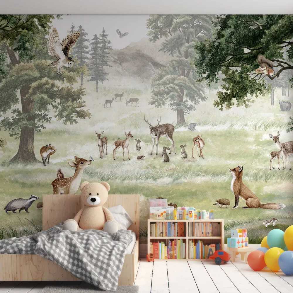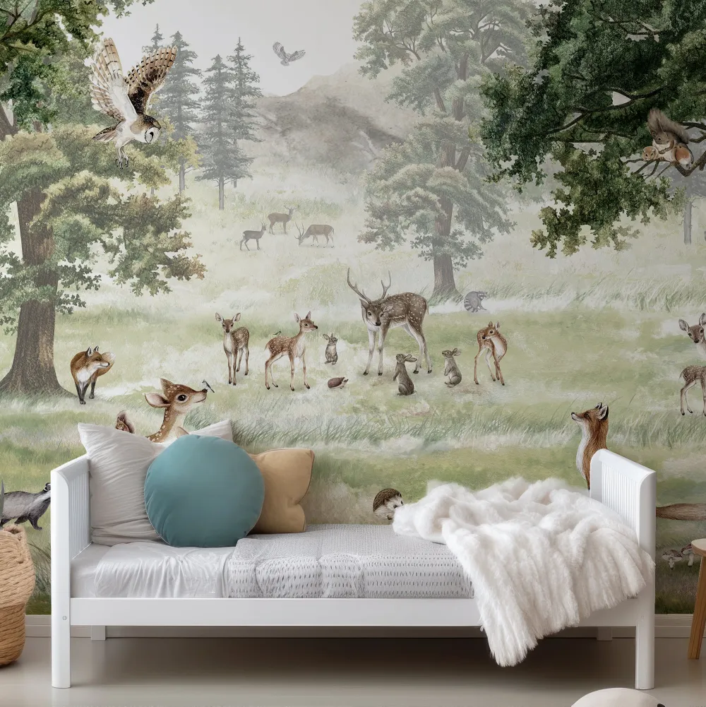 O Papel de Parede Floresta Encantada com Animais transforma o quarto do seu filho em um cenário mágico com uma ilustração vibrante de veados, coelhos e texugos em meio a árvores verdes exuberantes. Este papel de parede traz a beleza da natureza para dentro de casa, criando um ambiente acolhedor e encantador, ideal para inspirar a imaginação das crianças.