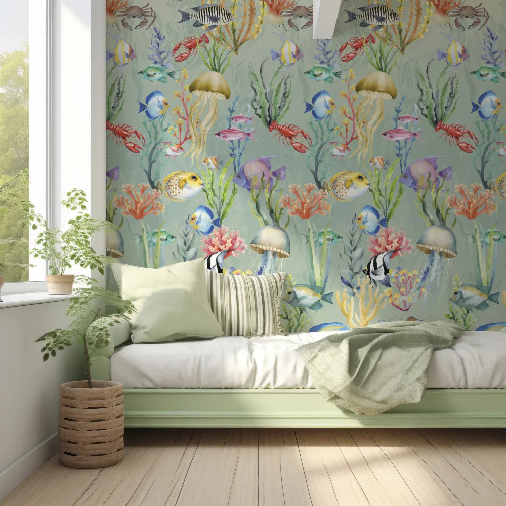Explore a tranquilidade dos oceanos com o 'Papel de Parede Fundo do Mar Aqua'. Inspirado nas calmas águas tropicais, este design apresenta uma paleta de cores suaves que trazem paz e serenidade ao seu ambiente. Com criaturas marinhas encantadoras e recifes de corais vibrantes, é perfeito tanto para banheiros quanto como um mural impactante na sala de estar. Transforme seu espaço com esta decoração relaxante e criativa, ideal para amantes do mar.