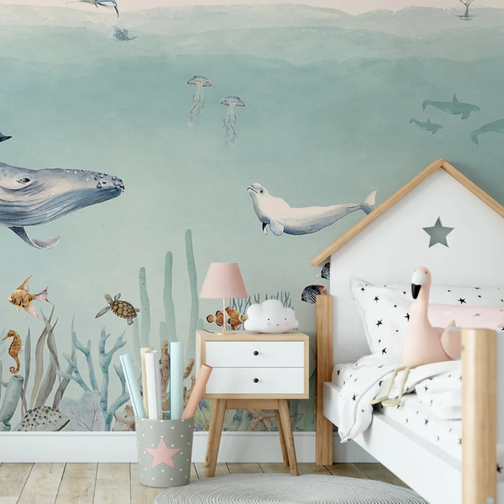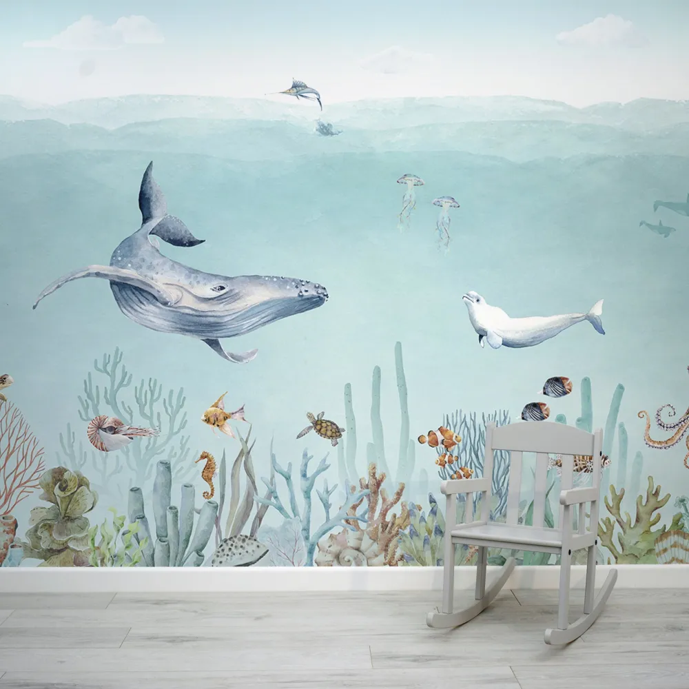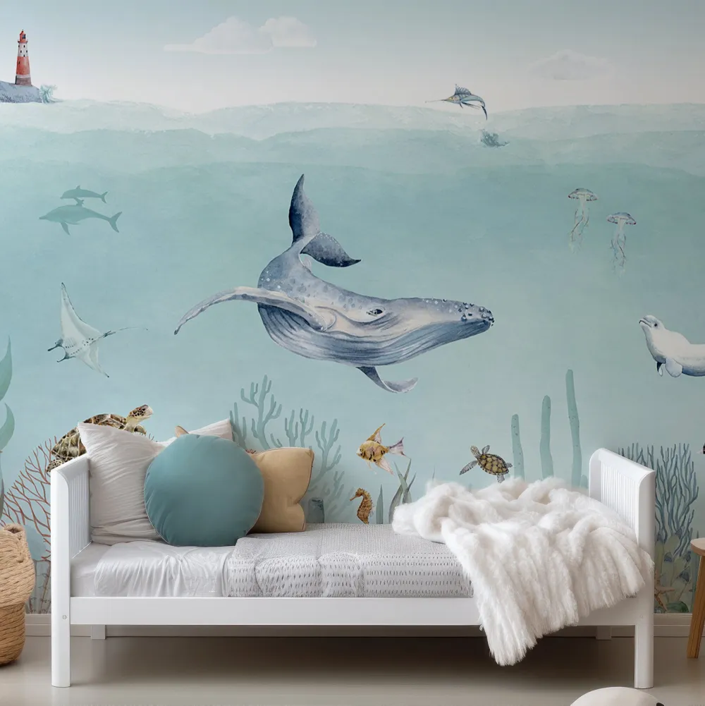 Mergulhe em um mundo subaquático encantador com o papel de parede 'Fundo do Mar Aquarela'. Este fundo azul suave convida a explorar as profundezas do oceano, onde majestosas baleias, tartarugas brincalhonas e polvos misteriosos nadam entre plantas marinhas vibrantes. Luminárias encantadoras em vermelho e branco adicionam um toque de charme a esta obra-prima em aquarela. Perfeito para um quarto infantil ou uma sala de recreação, este papel de parede captura a mágica do fundo do mar.