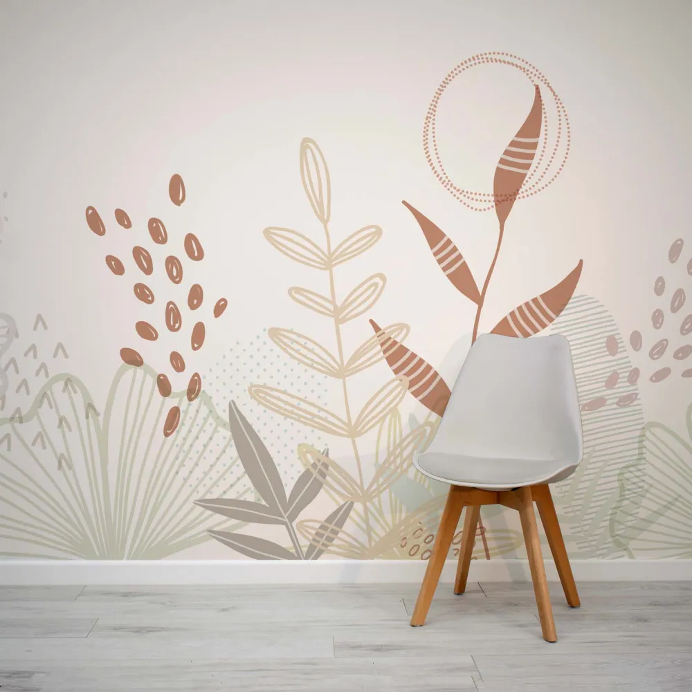 O Papel de Parede Infantil Folhagem Neutra traz uma atmosfera calma e acolhedora para quartos de crianças. Com ilustrações simples de plantas e folhas em tons neutros de marrom, bege e rosa, sobre um fundo claro, ele combina perfeitamente com móveis de madeira e texturas naturais, criando um ambiente relaxante e harmonioso.