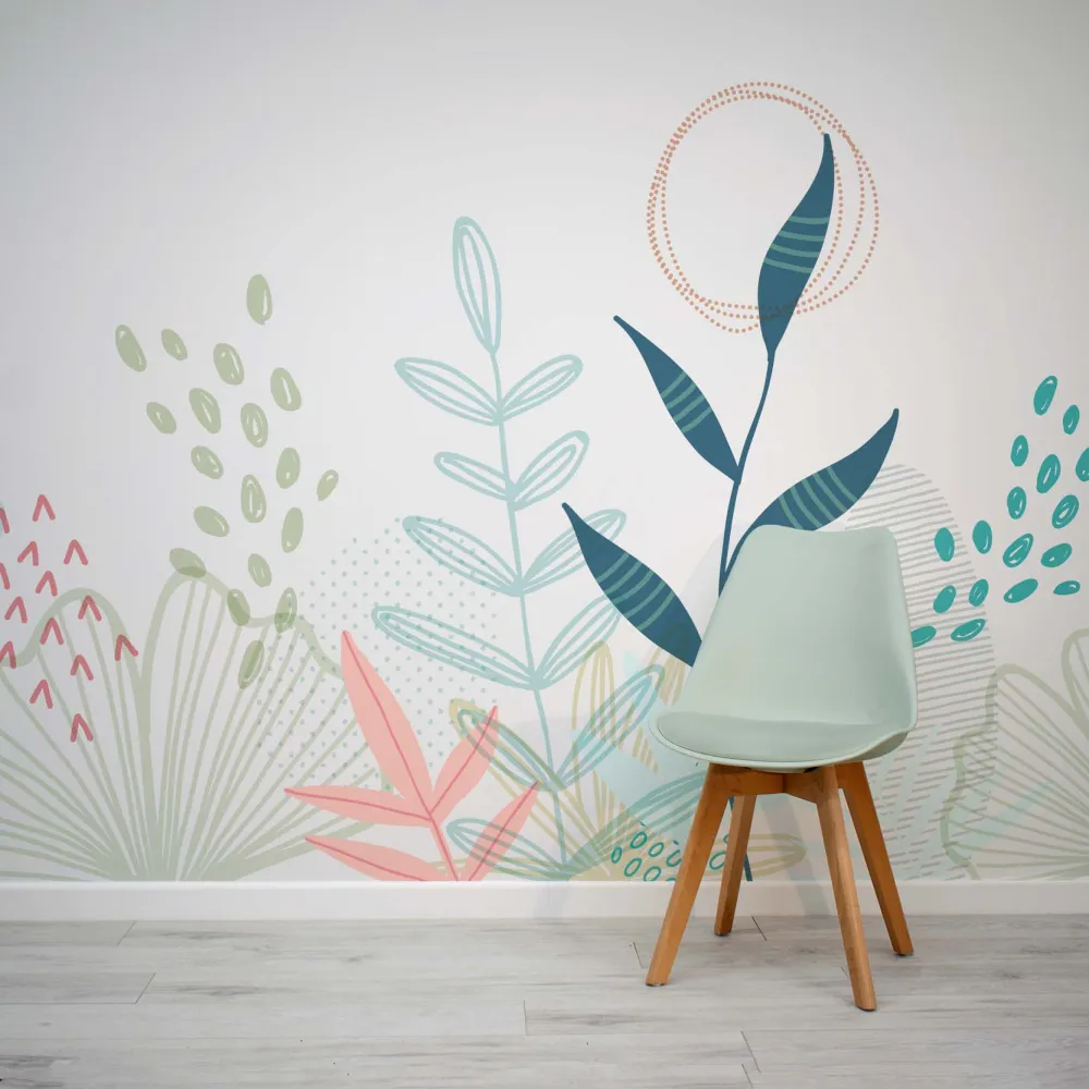 O Papel de Parede Infantil Folhagens Coloridas traz um ambiente alegre e divertido para o quarto das crianças. Com ilustrações de folhas e plantas em um estilo de cartoon, as cores suaves de azul, verde e rosa se destacam sobre um fundo cinza claro. Ideal para compor um espaço lúdico e moderno, este mural combina perfeitamente com móveis simples e pode ser complementado com elementos de cores sólidas.