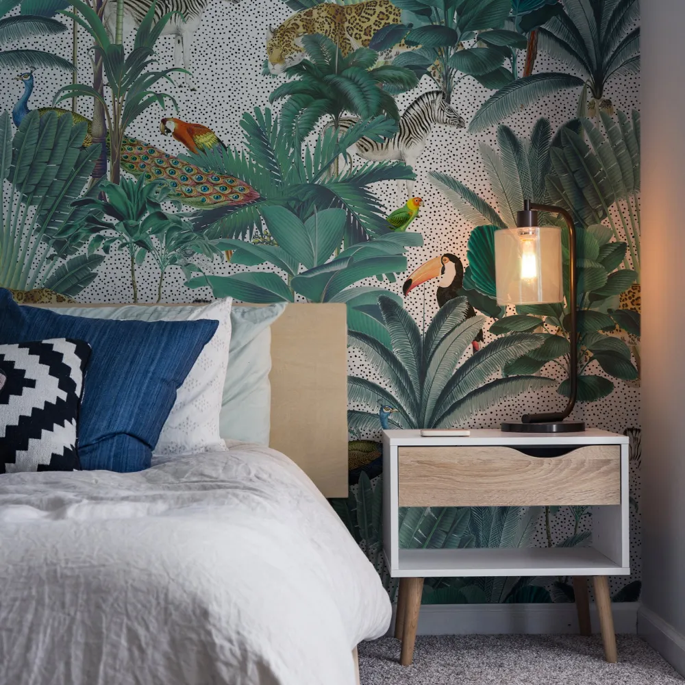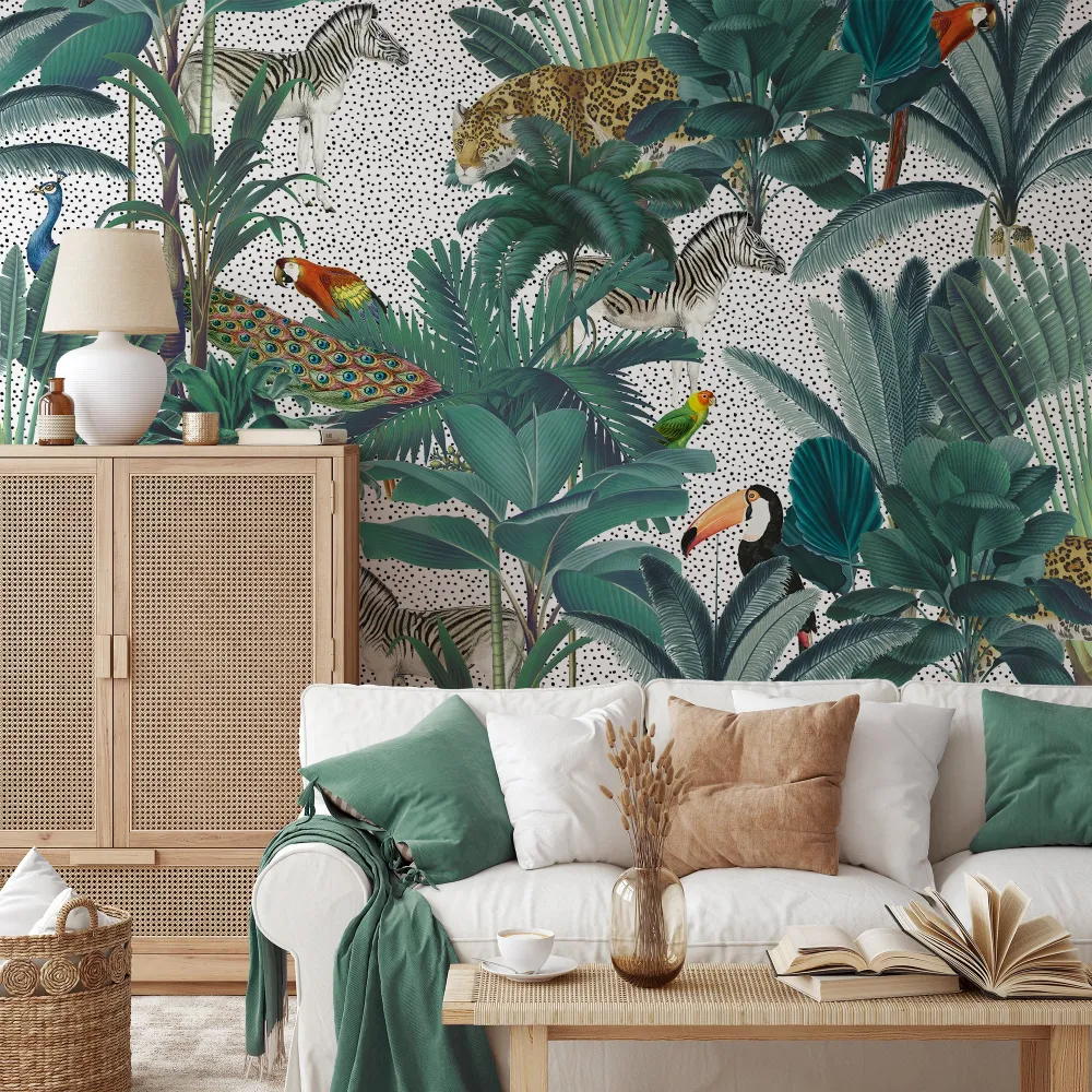 Transforme seus ambientes com o Papel de Parede Jungle Tropical Verde e Branco. Este papel vibrante apresenta uma exuberante vegetação tropical em tons de verde menta e um fundo branco com delicados pontos pretos. Com elementos de fauna exótica como zebras, tucanos, araras, pavões e jaguares, ele traz a atmosfera de uma verdadeira selva para dentro de casa. Ideal para criar um espaço acolhedor e cheio de vida, este papel de parede é fácil de aplicar e promete encantar toda a família.