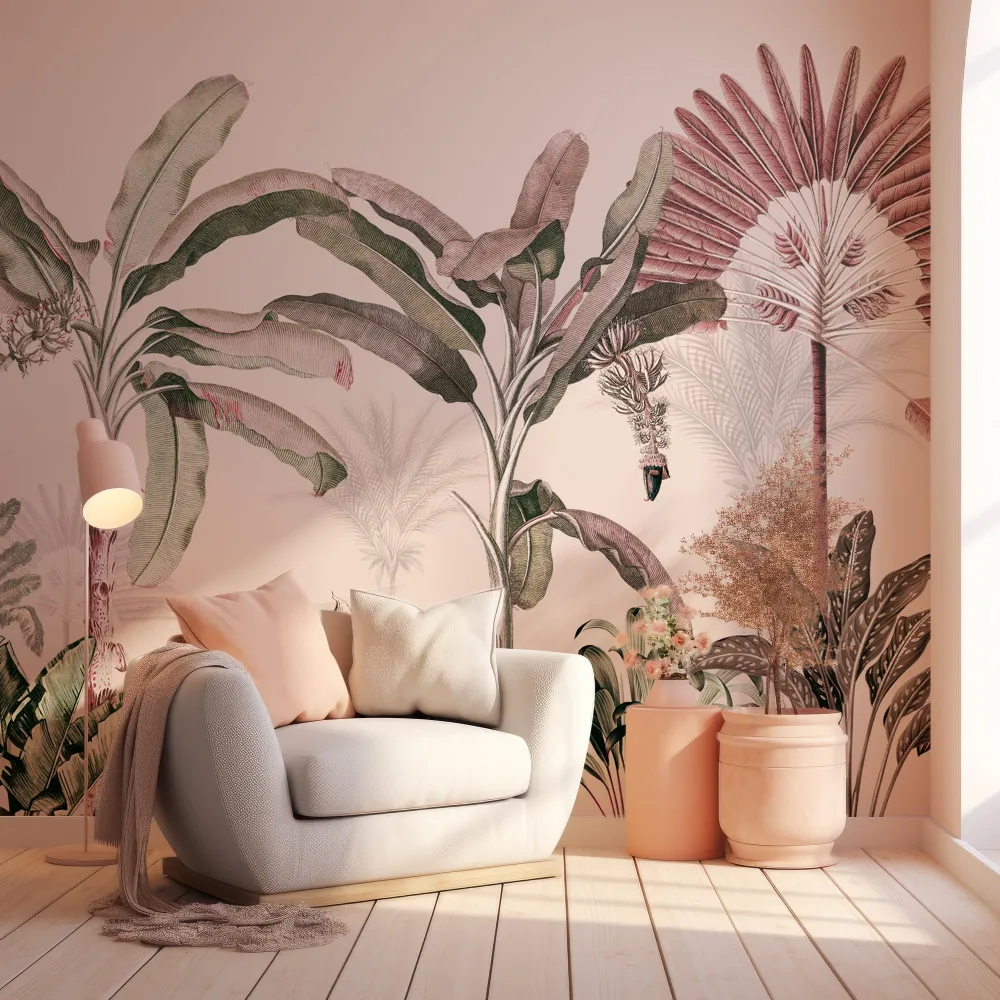 Mergulhe em um paraíso tropical com o Papel de Parede Jungle Vintage Rosa e Verde. Este design encantador apresenta uma ilustração vintage de exuberantes plantas tropicais e majestosas palmeiras, incluindo imponentes bananeiras. O fundo suave em tons pastéis realça os quentes matizes de rosa e verde da folhagem intricada, criando uma atmosfera relaxante e elegante. Os detalhes finos e o estilo gravado da ilustração capturam a beleza das paisagens naturais exuberantes, convidando a uma sensação de tranquilidade e aconchego em seu espaço. Ideal para quem deseja adicionar um toque de elegância exótica e um sutil hint de destinos distantes ao ambiente.