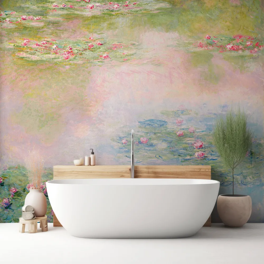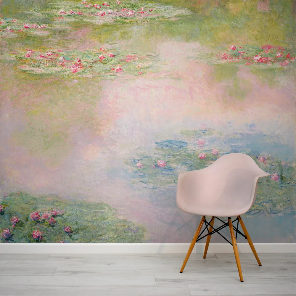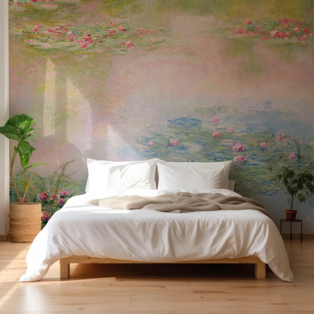 Transforme seu ambiente com a beleza serena do Lago dos Lírios, inspirado nas famosas obras de Claude Monet. Este papel de parede apresenta uma mistura etérea de cores pastéis suaves, em tons de rosa e verde, capturando a delicadeza das folhas e flores de lírio flutuando em águas calmas. As reflexões e os detalhes em suave desfoco criam uma atmosfera tranquila e quase onírica. Ideal para adicionar um toque de elegância natural e paz, este mural traz o encanto atemporal da arte de Monet para qualquer cômodo.