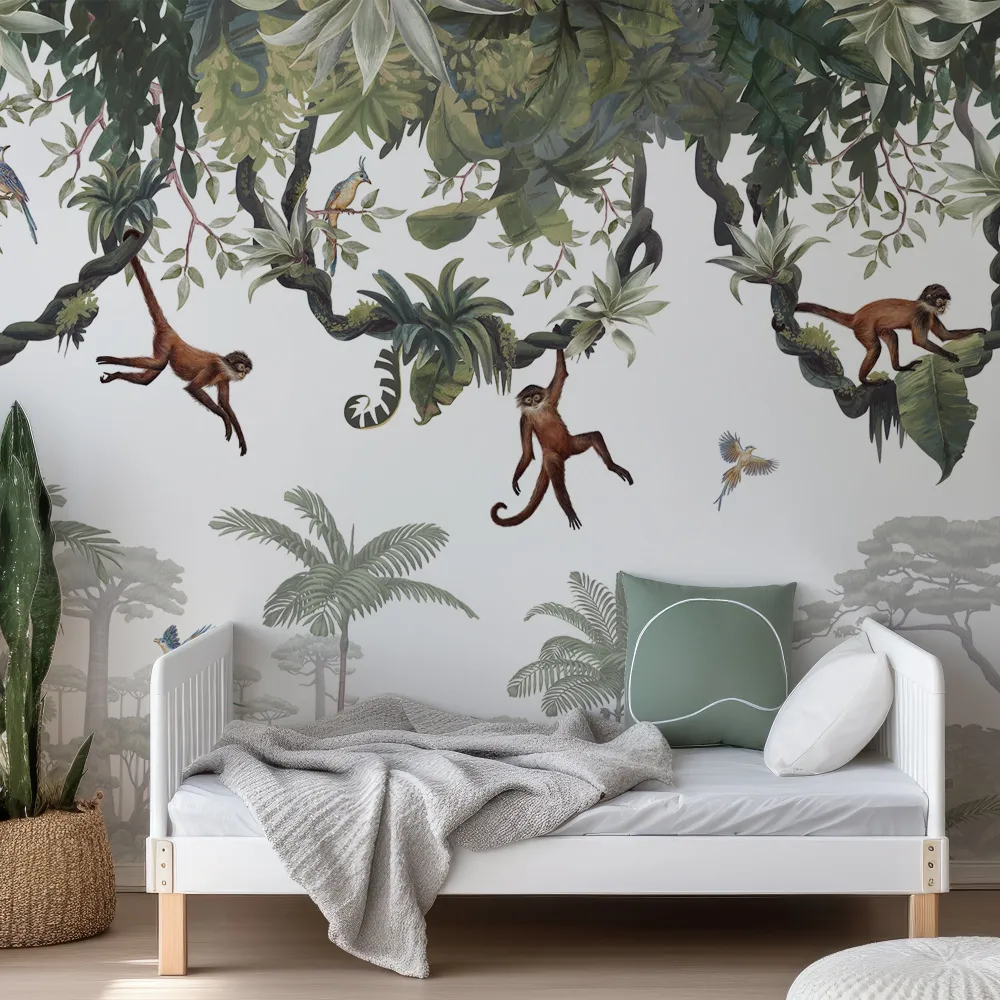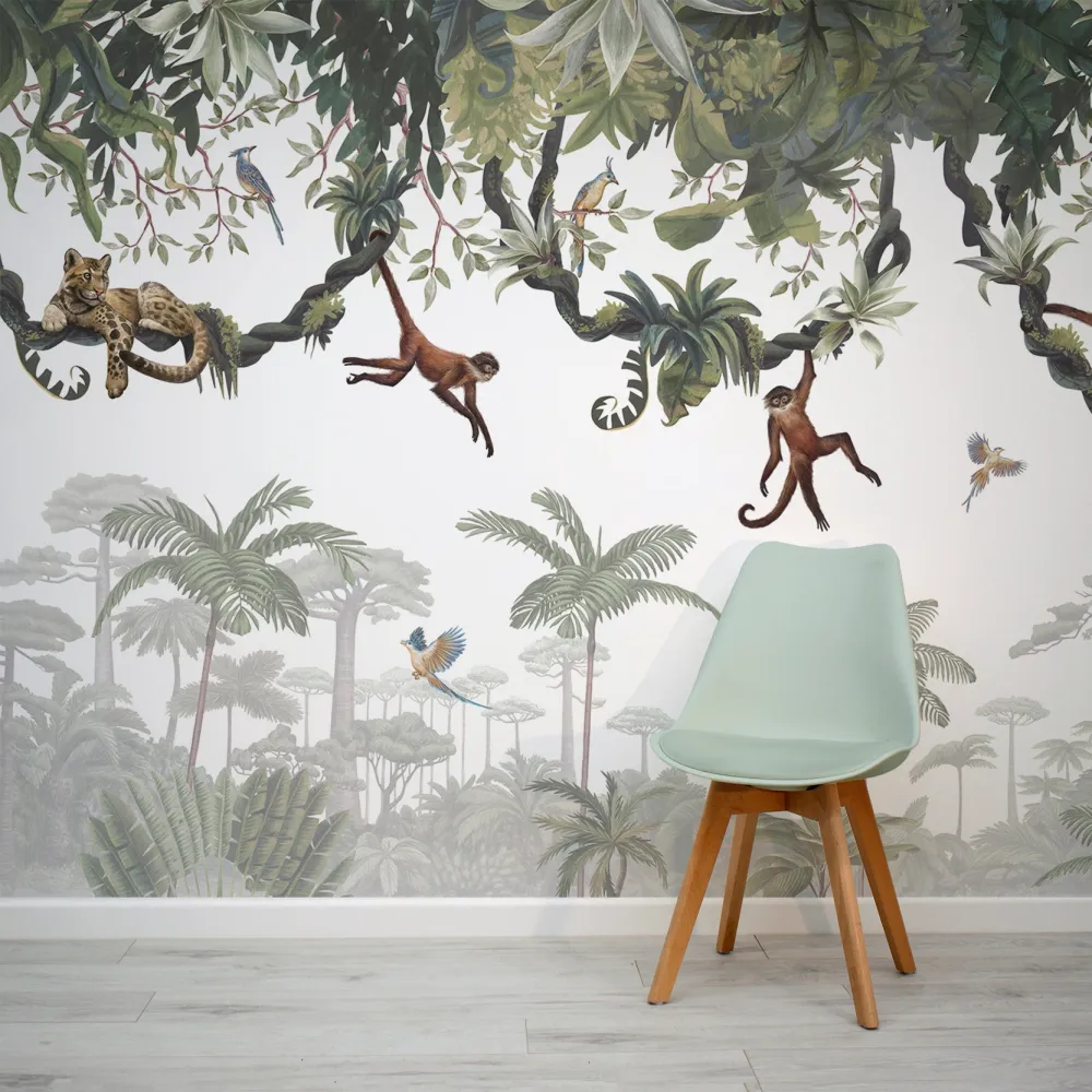 Transforme seu ambiente em um paraíso tropical com o papel de parede Macacos Brincando nas Árvores. Com um fundo branco, a folhagem exuberante ganha vida, decorada com macacos travessos balançando entre os galhos. Um leopardo astuto se esconde na vegetação, adicionando um toque de mistério. Este papel de parede verde e branco traz um ar divertido e sofisticado para qualquer cômodo, sendo ideal para amantes da natureza e crianças.