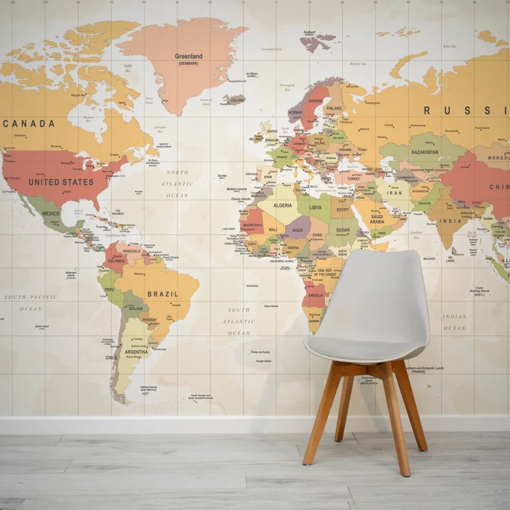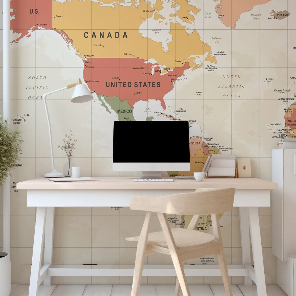 Transforme seu ambiente com este papel de parede que apresenta um mapa mundi em tons suaves de amarelo e laranja. Com um design retro e educativo, é perfeito para criar um espaço que une estilo e conhecimento, ideal para qualquer cômodo da casa.