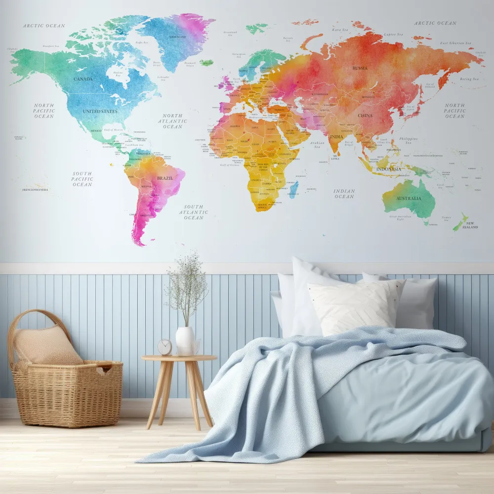 Transforme seu ambiente com o Papel de Parede Mapa Mundi Colorido, uma peça vibrante que traz uma representação do mundo com um toque artístico. Com um design adaptável, este mural se encaixa perfeitamente em qualquer espaço, tornando-se uma adição fascinante para o quarto das crianças ou qualquer local que precise de cor e criatividade.