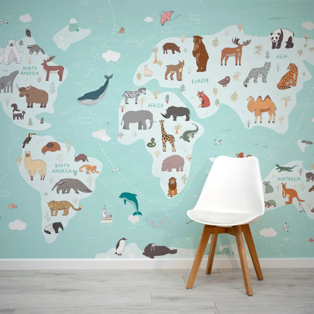 Papel de Parede Mapa Mundi de Animais em Azul MP