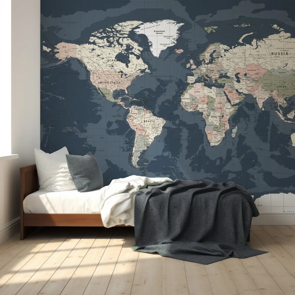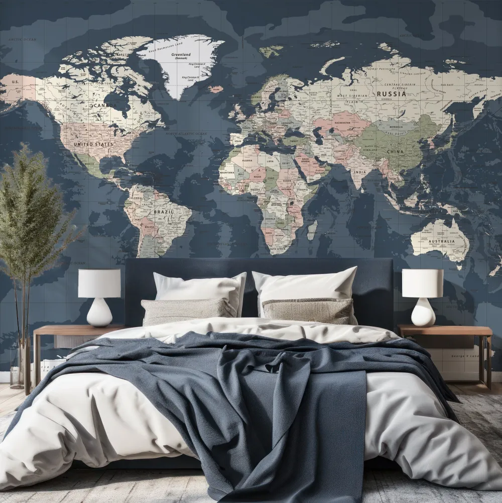 Explore o mundo com nosso Papel de Parede Mapa Mundi Vintage Escuro. Esta versão sofisticada do mapa-múndi traz um design detalhado e um tom escuro que se destaca em qualquer ambiente. Perfeito para quem busca um toque clássico e elegante, este mural é ideal para dividir espaços e adicionar personalidade às suas paredes. Com uma paleta de cores que complementa o azul profundo dos oceanos, ele é uma escolha atemporal para a decoração do seu lar.
