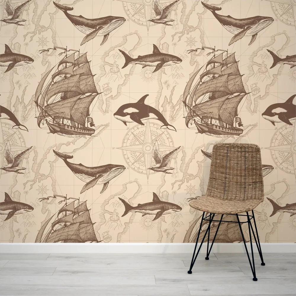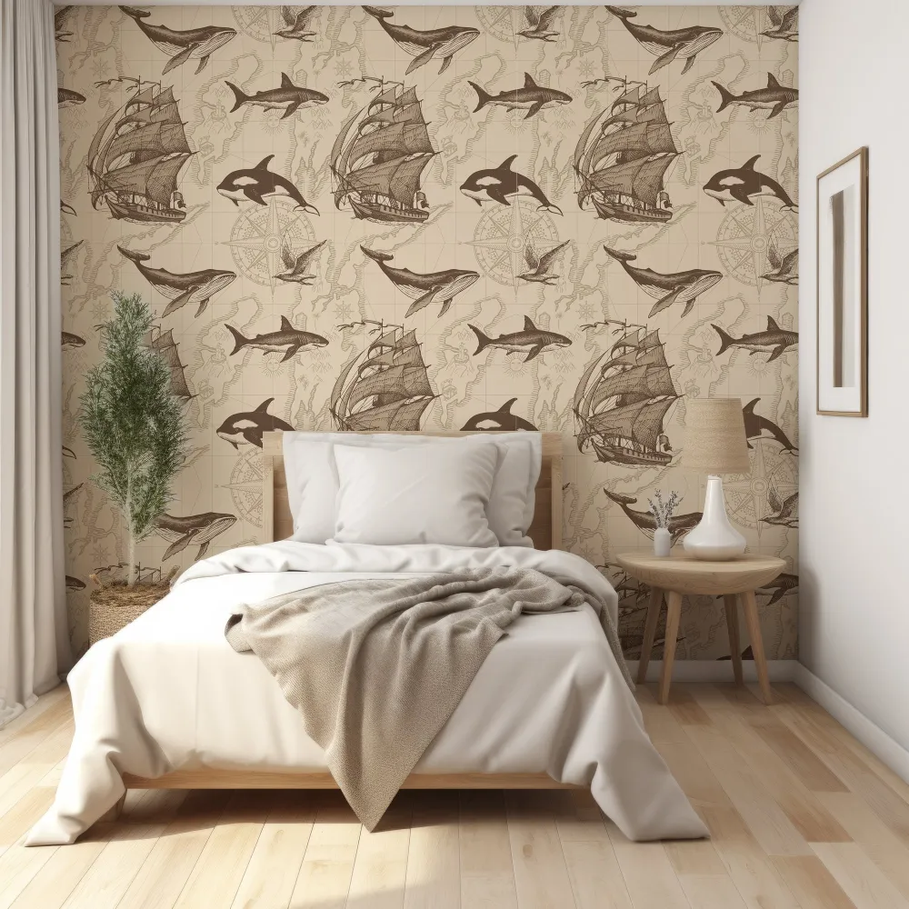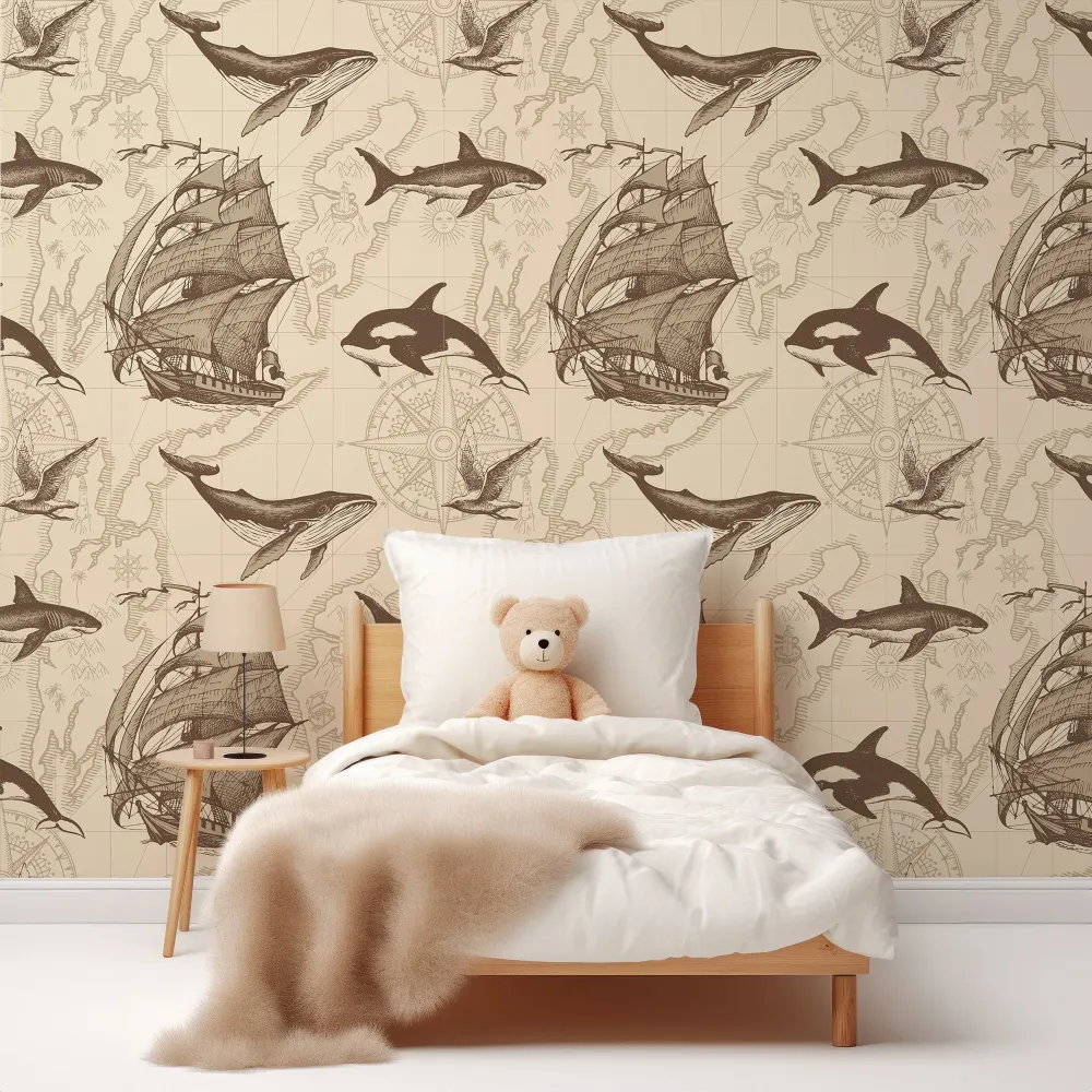 Navegue por mares de imaginação com este elegante papel de parede que combina tons de bege e marrom, apresentando ilustrações de navios piratas, baleias, tubarões e orcas, além de continentes mapeados. Ideal para criar um ambiente que remete a aventuras marítimas e à exploração.
