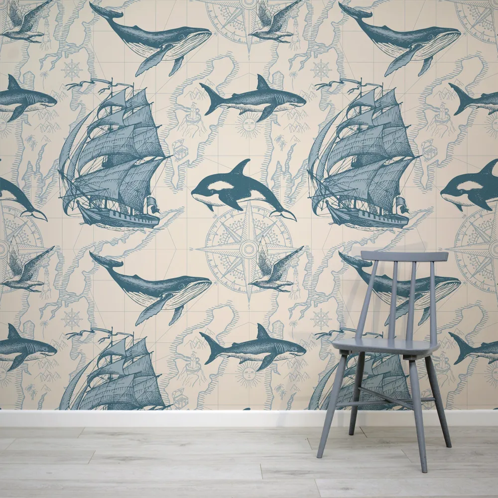 Papel de Parede Mapa Náutico com Barcos e Baleias MP