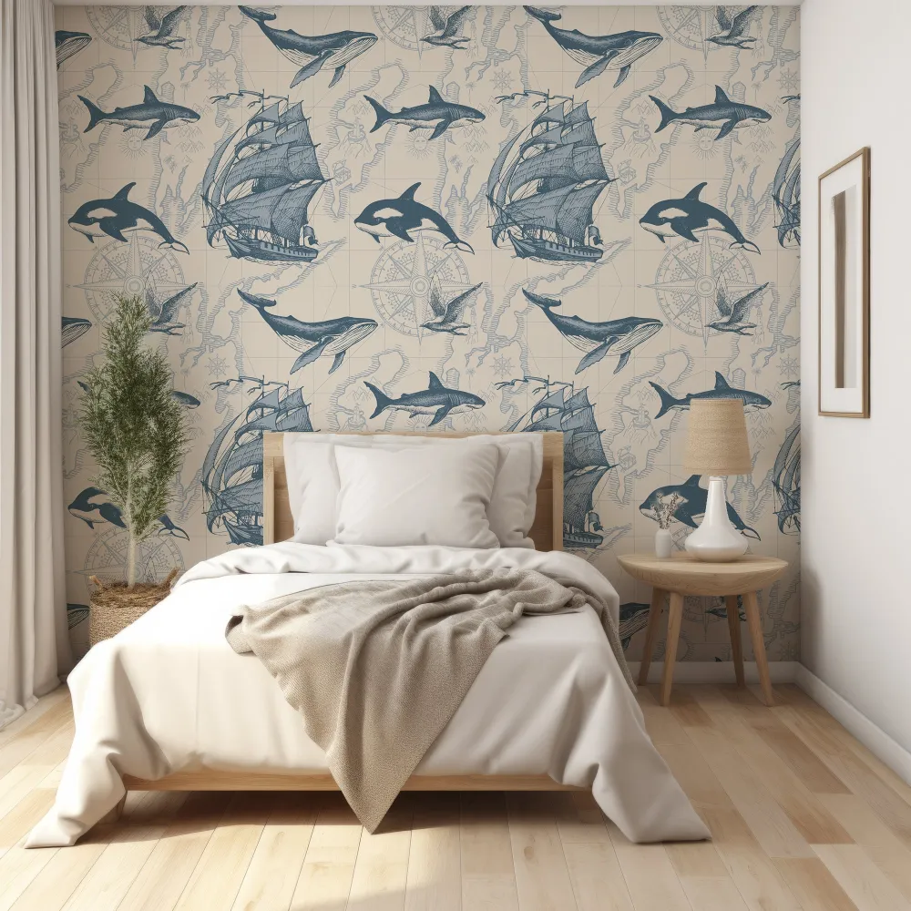 Embarque em uma aventura marítima com este papel de parede que apresenta um fundo bege claro adornado com ilustrações azuis de barcos piratas, baleias, tubarões, orcas, gaivotas e continentes de mapa. Com um estilo que remete a mapas de piratas vintage, este design convida a uma odisséia náutica pelos altos mares.